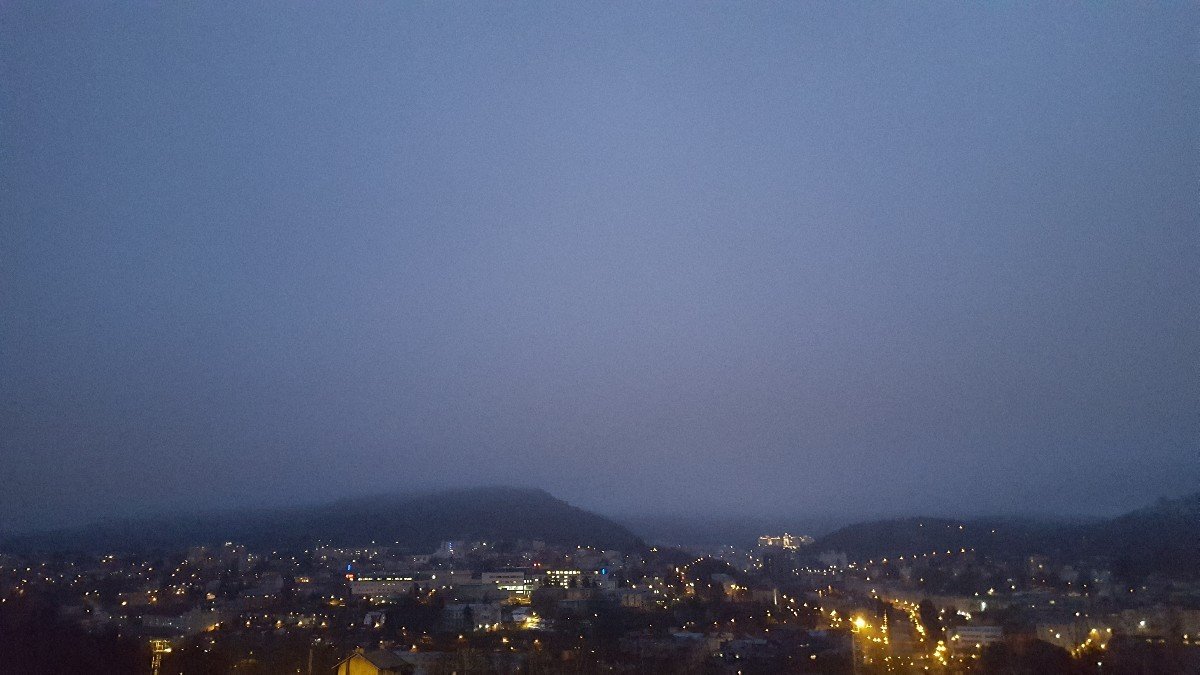 6,5°C, skoro jasno, byli jsme na vycházce na kopečku za zahradou a objevili jsme na vrcholu kopce velké kaluže. (fotka je stará kolem 30 minut).