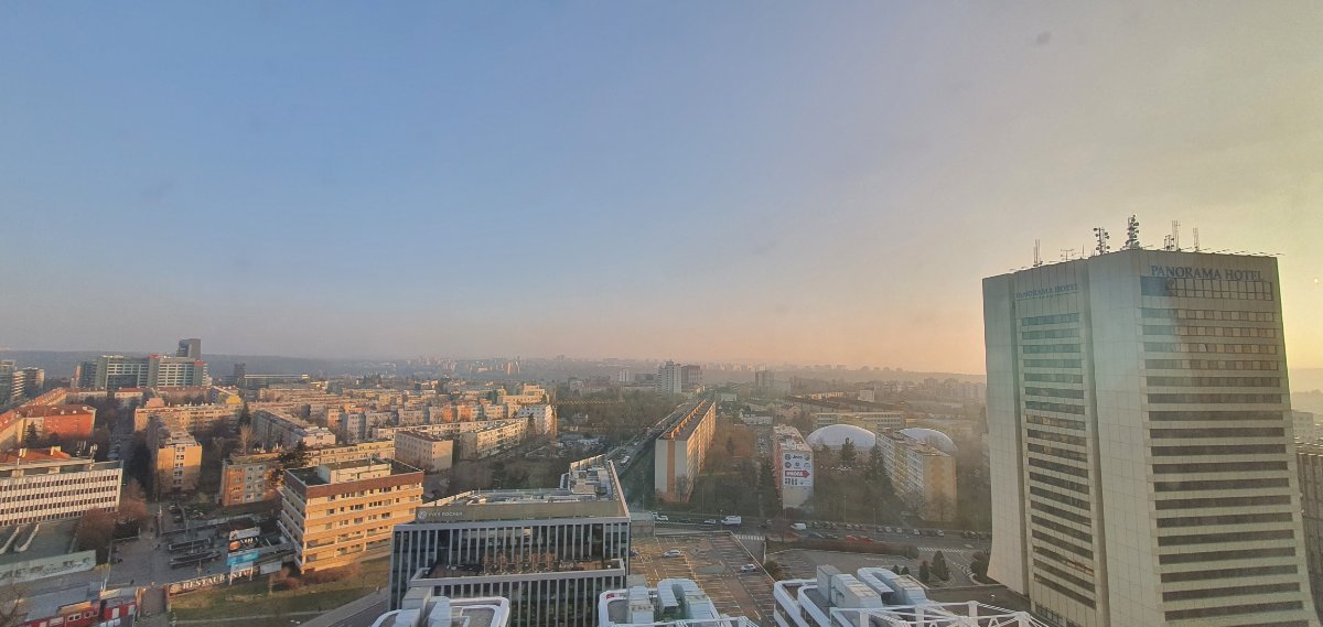 4,3°C, skoro jasno. mraky sedí na hoře Kozubove a Ostrý.
