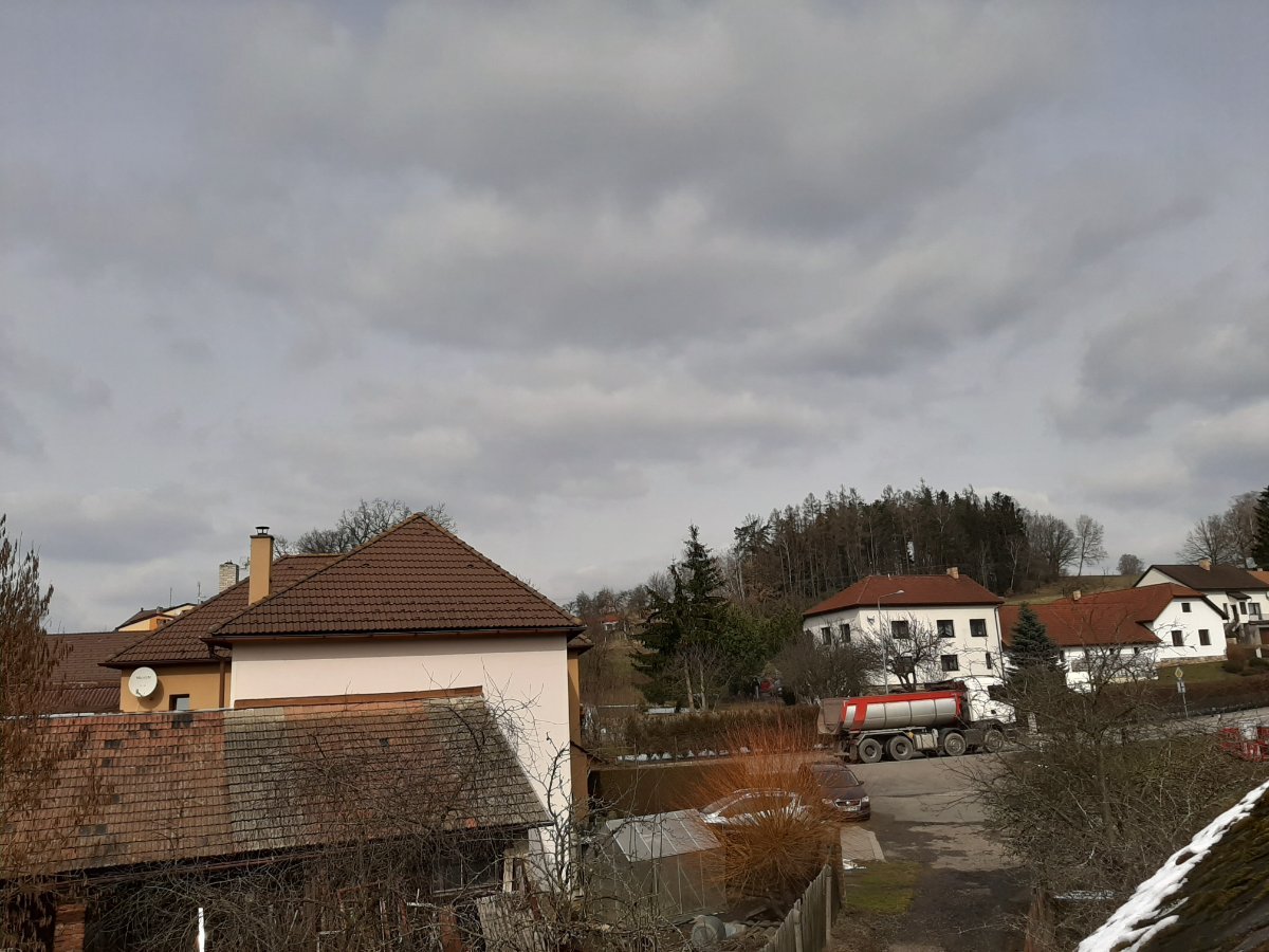 Skoro zataženo převážně vysokou oblačností, přes kterou prosvítá slunce. JV vítr 9 km/h, tlak 1019 hPa, vlhkost 53 %. Dnešní minimální teplota klesla na -5,6 °C.