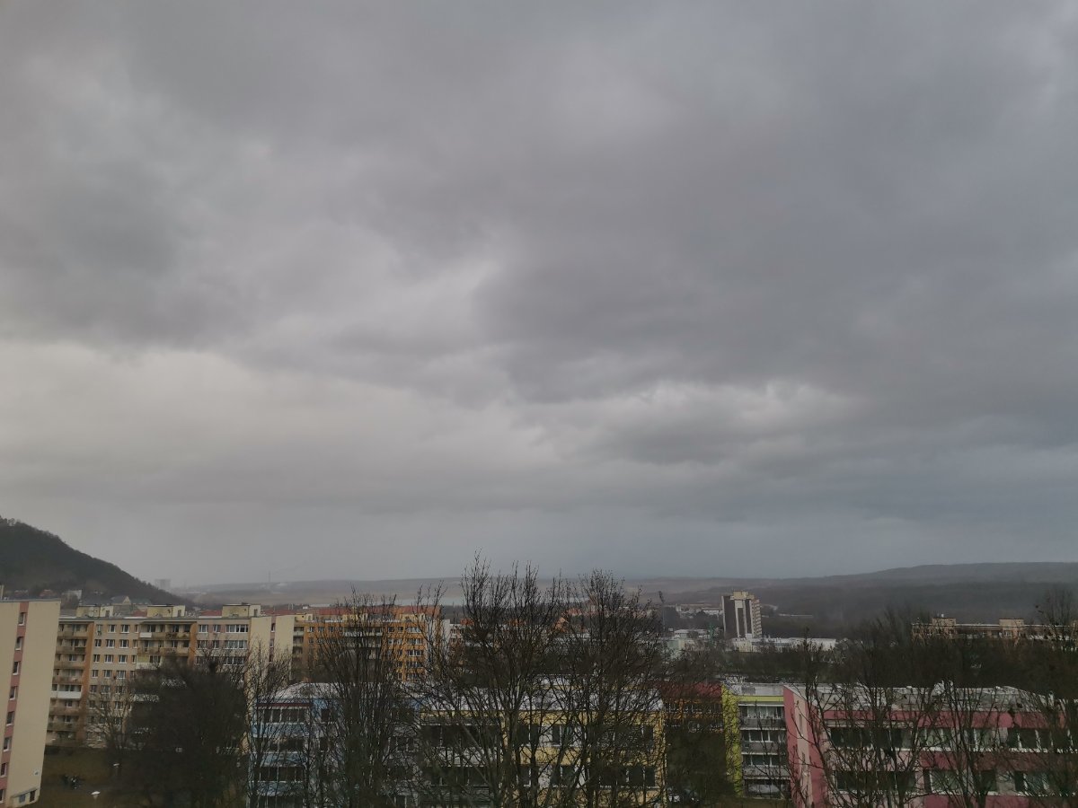 Hodně fouká, les hučí, to zase bude popadaných stromů. Tlak 1010 hPa, vítr JV 13 km/hod.