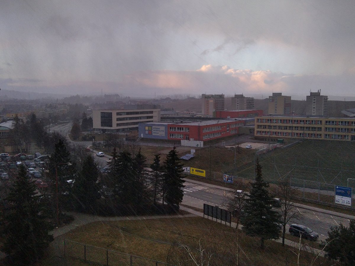 0,5°C, velmi silná sněhová přeháňka s obrovskými uličkami.
