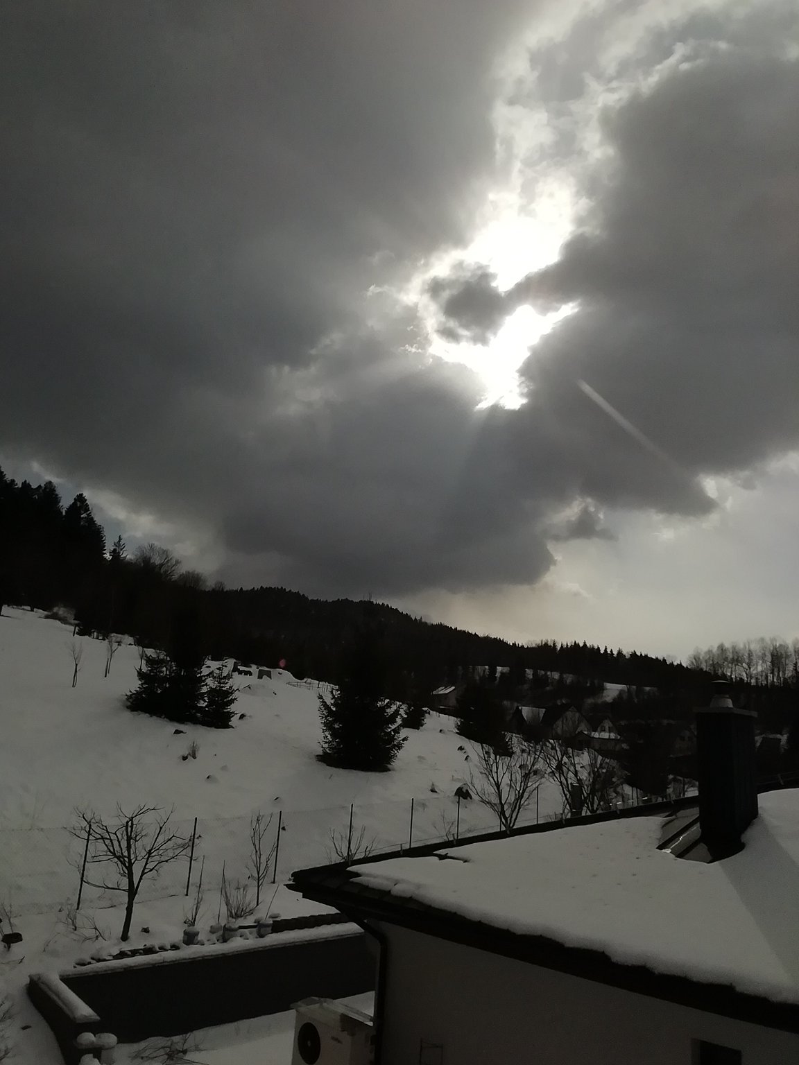 Aktuálně převažuje většinou skoro zataženo občas oblačno, slabé sněhové přeháňky a fouká většinou slabý až mírný studený vítr