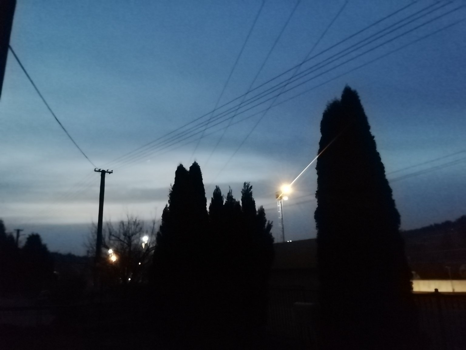 Rozpad dešťové přeháňky před západem slunce, chvilku u nás mrholilo a pak bylo po všem, aktualně pofukuje V větřík, vlhkost 45%, krepuskulární paprsky