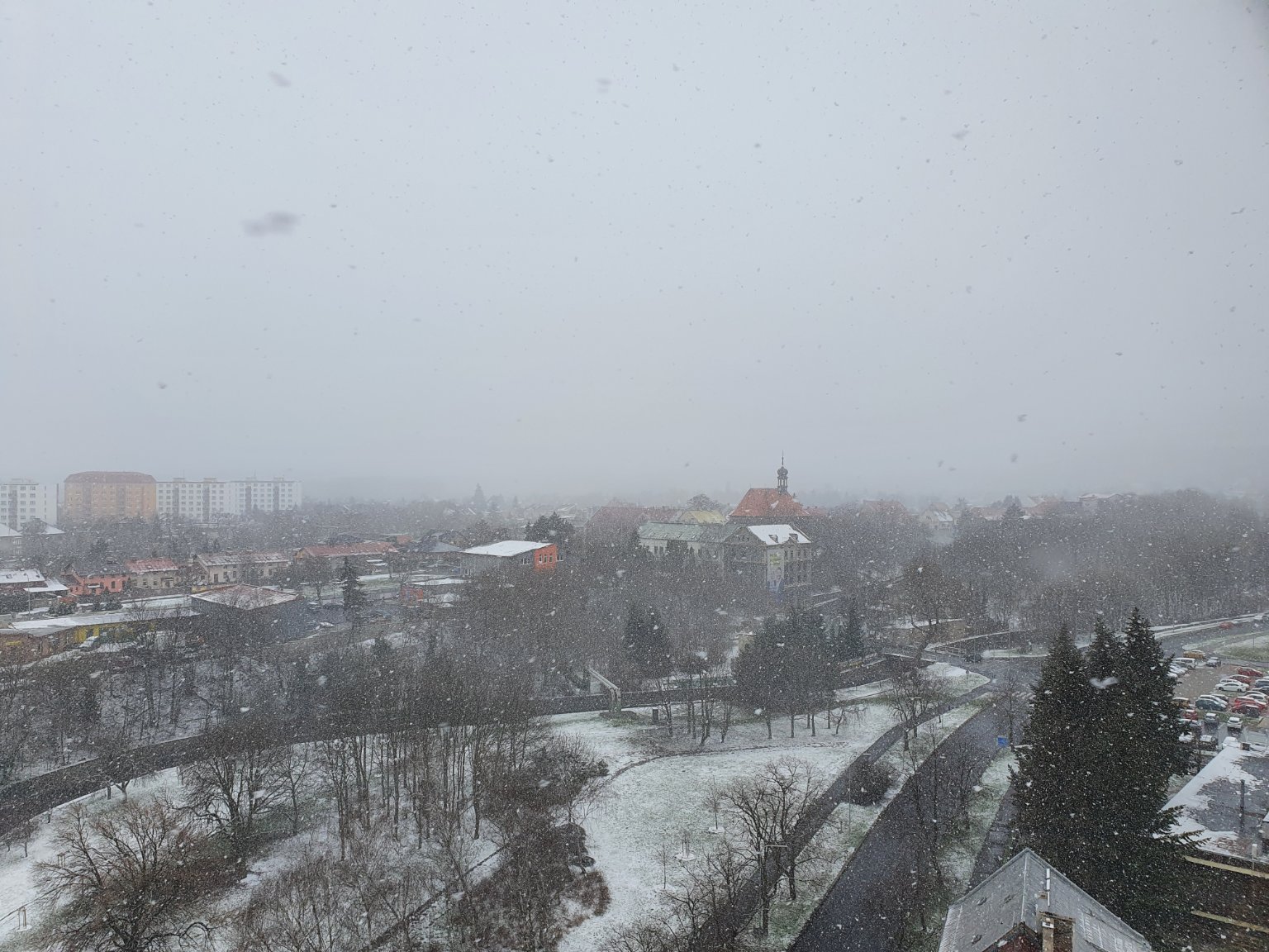 -1,1°C, Slabé sněženi. při slabým až mírným trvalým sněžením za hodinu napadl poprašek kolem 1.cm.