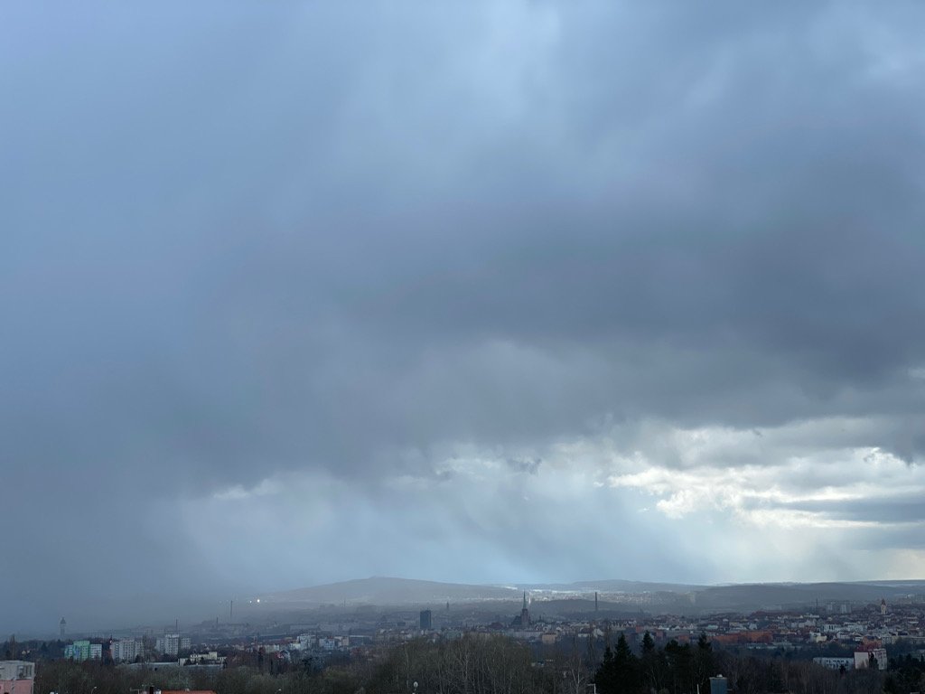 -0,7°C, Silná sněhová přeháňka stále řadí a už je bílo.
