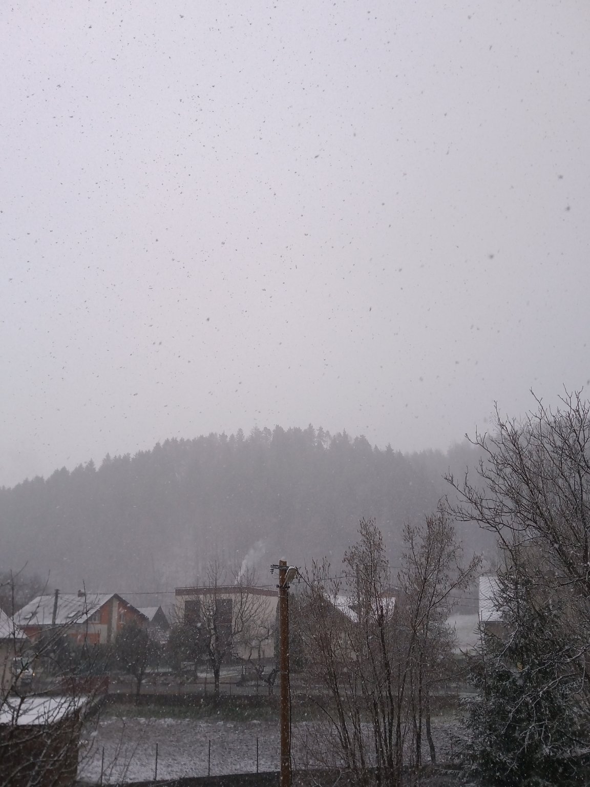 0,7°C, Slabá sněhová přeháňka. Překvapivě byla slabá i když jsou velké vločky.