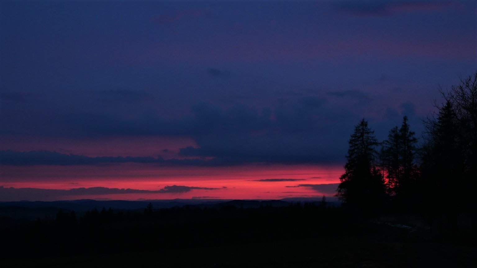 Klidno, celý den halový jevy, západ slunce a halový sloup