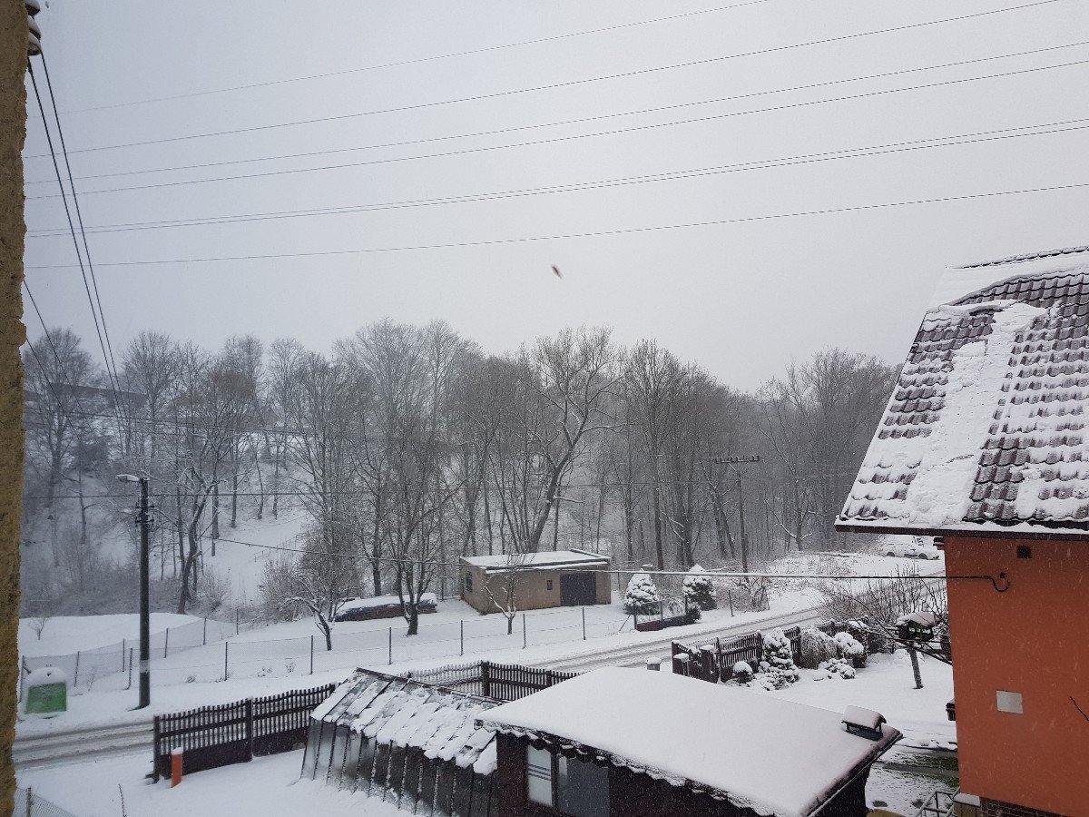 Zamračené, slabunke sneženie, sneh 13 cm.