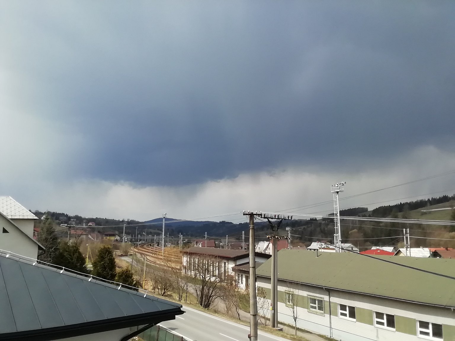 Zatím slabě prší. Vítr Z 18 km/hod. A kroupy začaly padat.