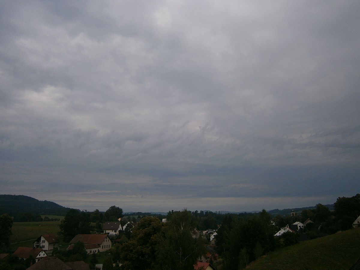 všude tmavé mraky jen na západě dle fotky z 2013 08 19 v 09:06 kousek modré oblohy