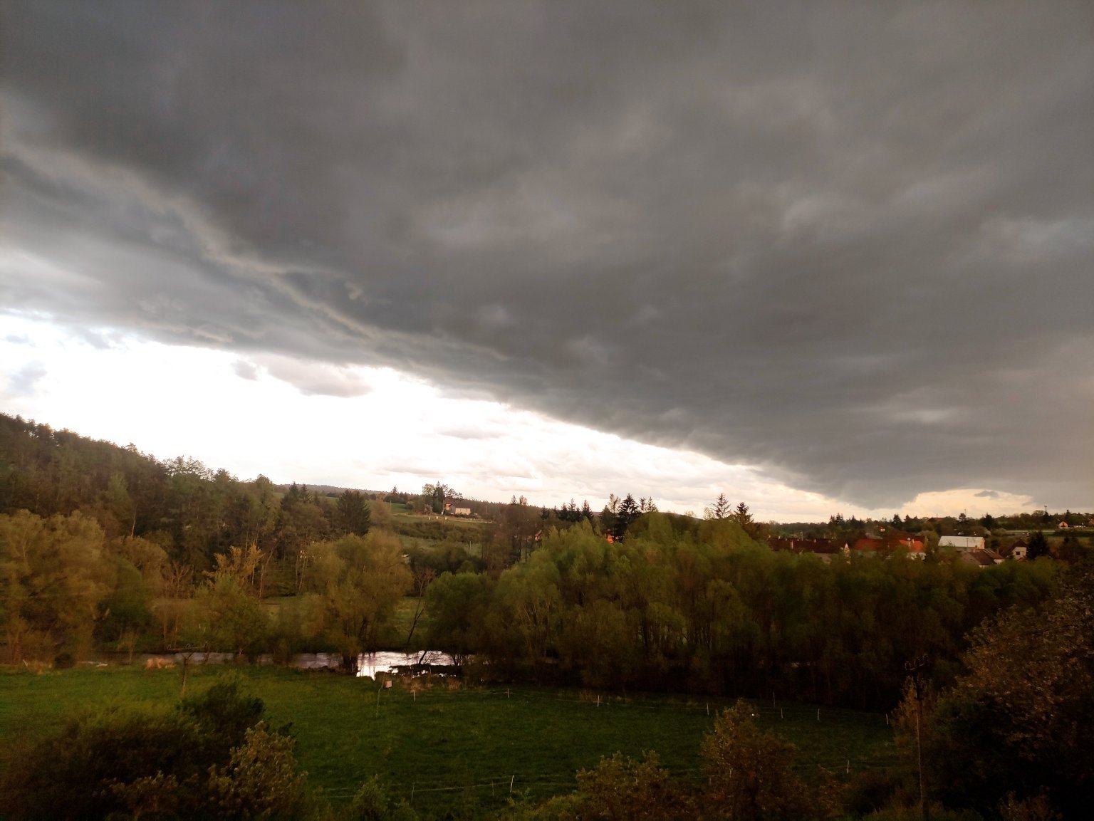 13,9°C, Polojasno. Tak tohle vypada jako menši Shelf-cloud, ale sražky jen kolem 1.mm/h.
