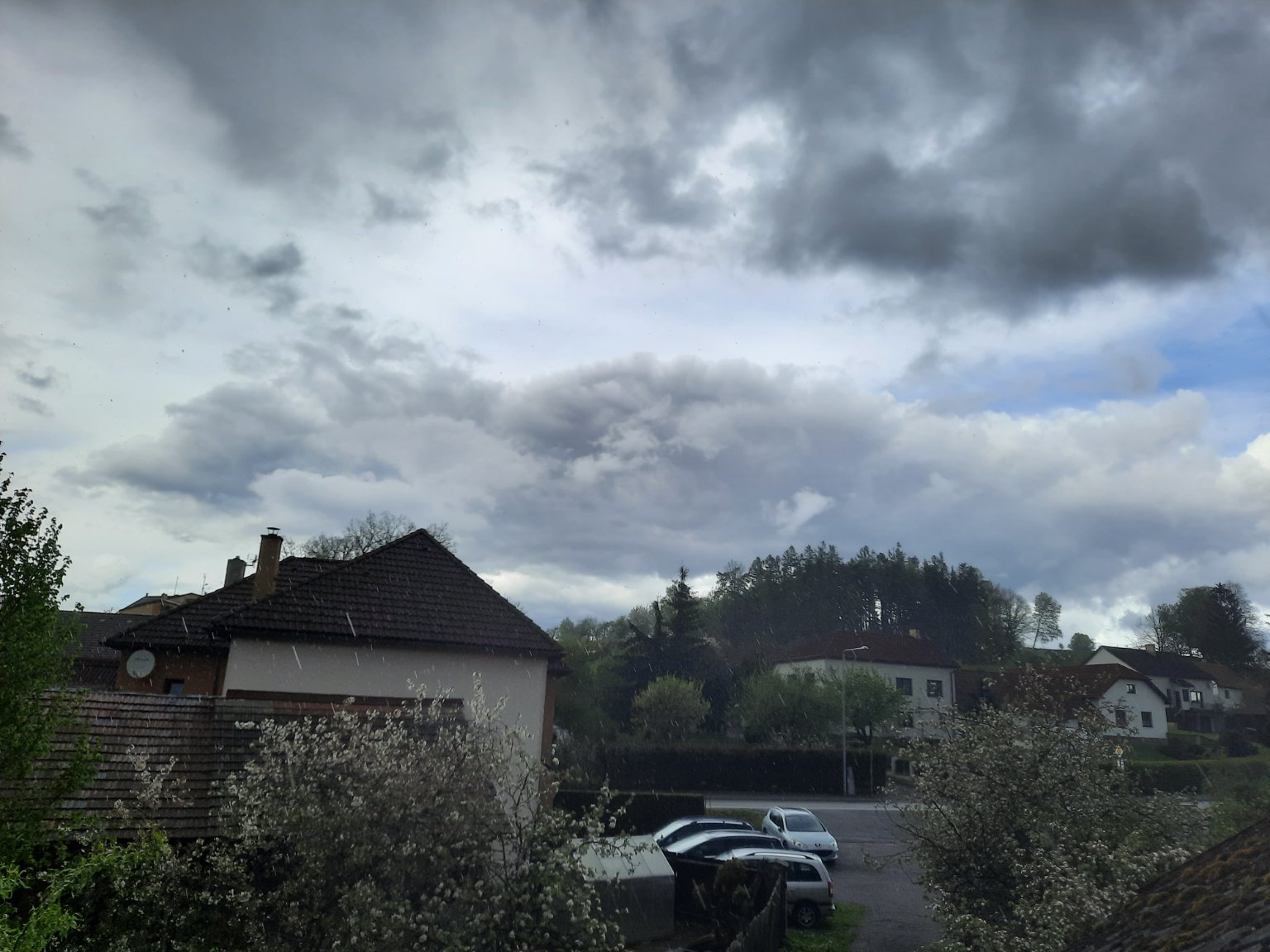 Zataženo a slabě prší. V okolí, hlavně východně od nás se však vyskytuje vnořená konvekce a velmi silné přeháňky. Vane slabý severozápadní vítr, tlak: 1003hPa.