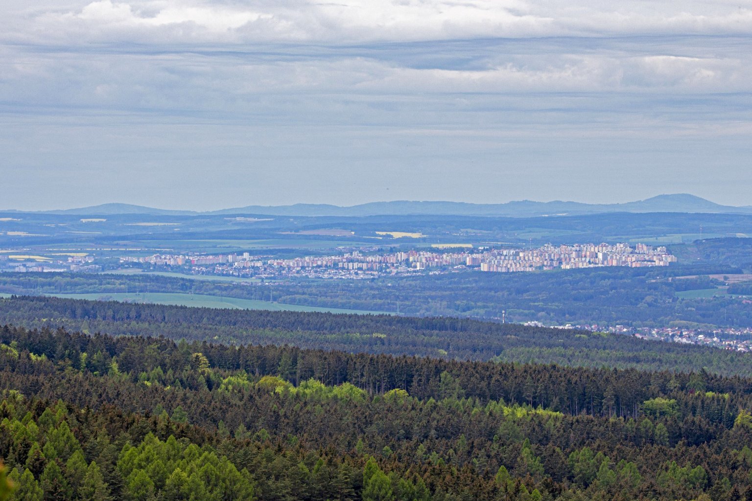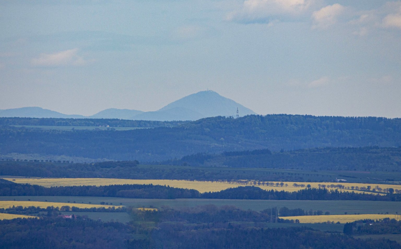 80 km vzdálený Klínovec z vrcholu Radeč. Patrná je i budova na vrcholu.