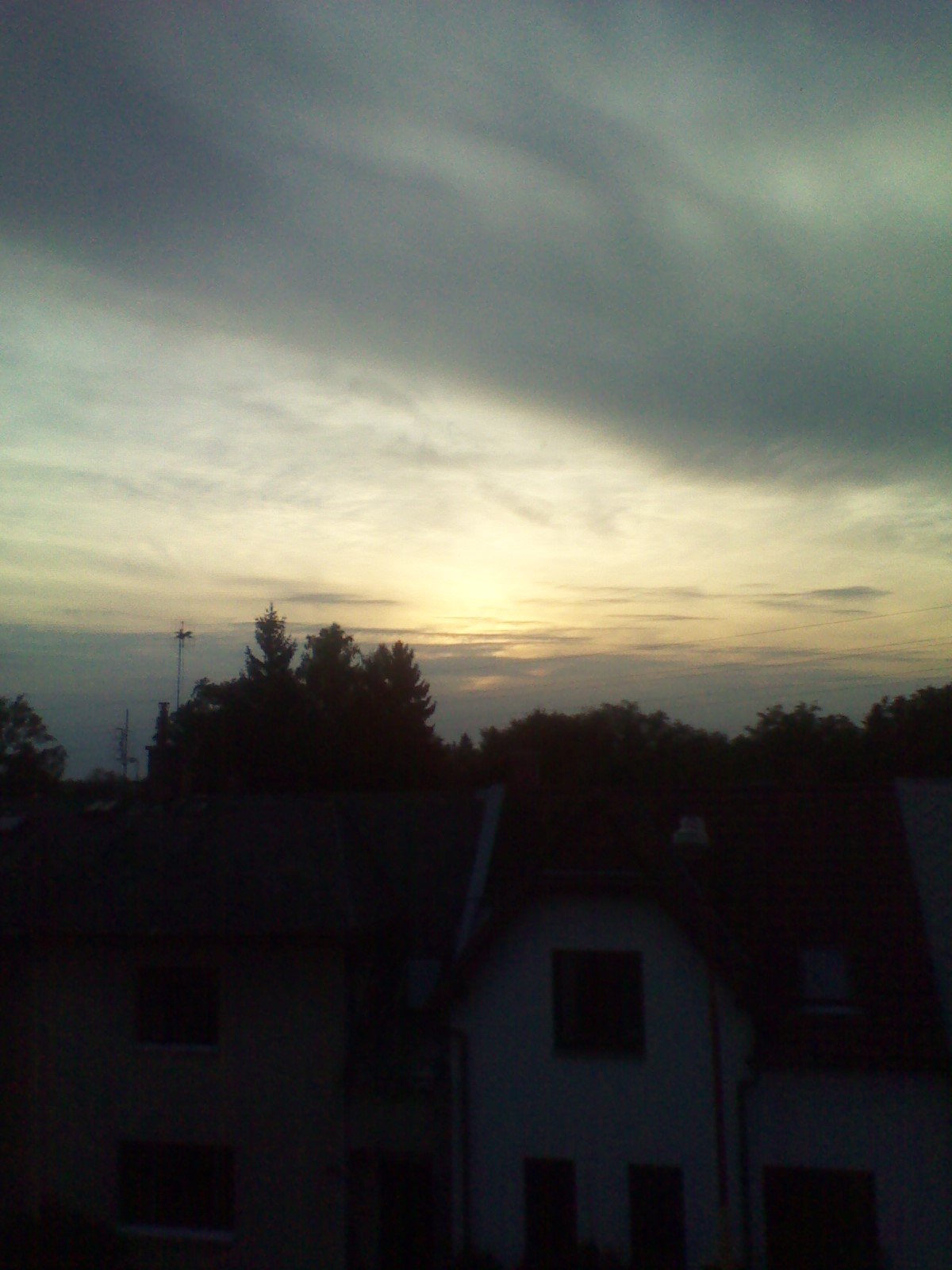 Oblačnosti trochu ubylo,vítr zeslábl na slabý,tlak 1017hPa,Slunce pomalu zapadá..