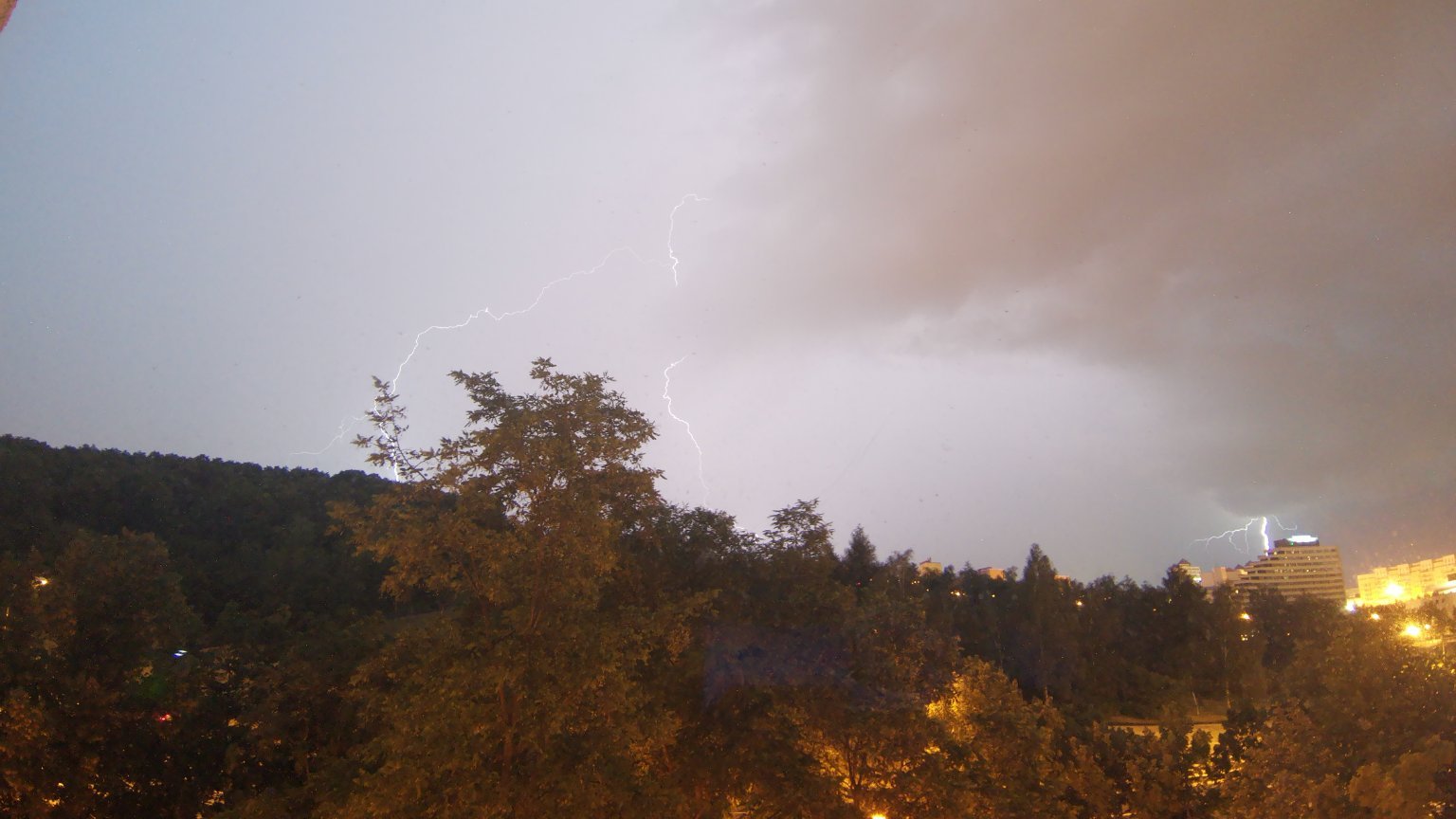 jeden blesk za druhým a časté hlasité hřmění, začíná už pršet a zvedá se vítr, 18°C