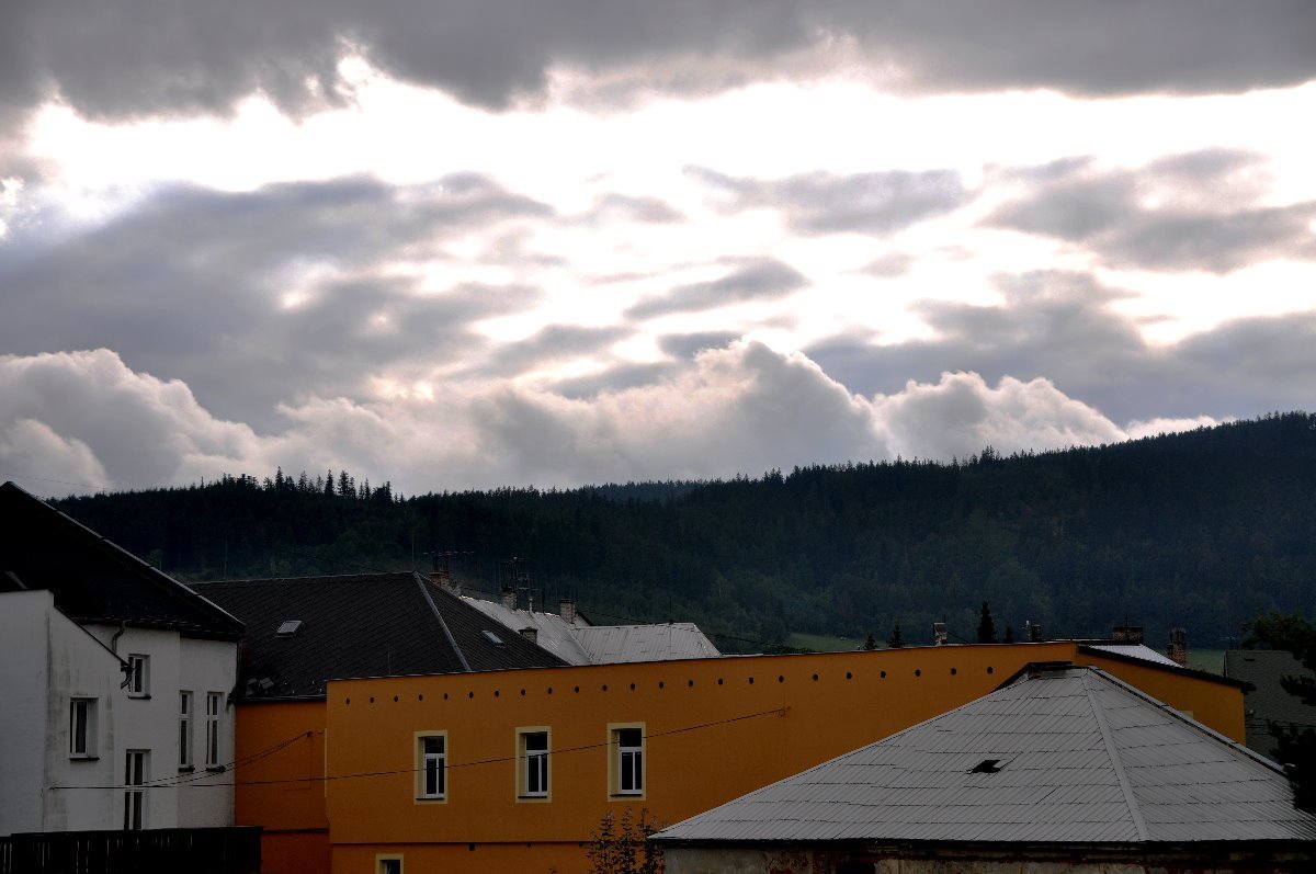 Zataženo, občasný déšť, slabý západní vítr, tlak 1021 hPa.