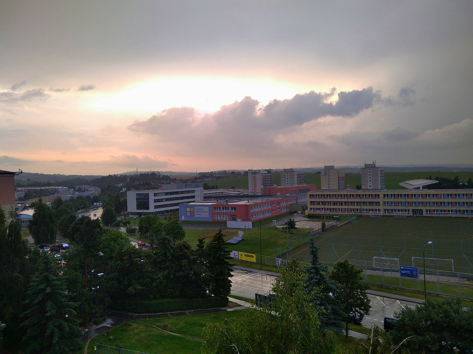 Začíná pršet, párkrát zahřmělo. Posílám pohled na blížící se bouřku v Klučově na Vysočině dnes odpoledne, foto/17:40.
