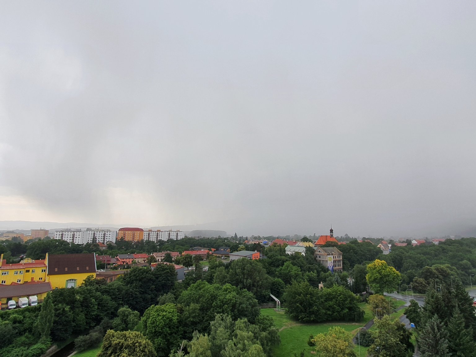 Velmi, velmi silný déšť, blesky, hřmí, bouřka
