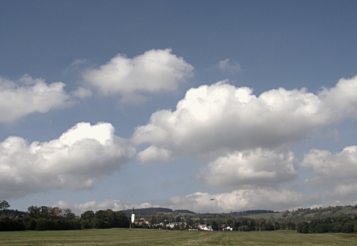 Slunečný den, na obloze jen čáry od letadel a draci :)