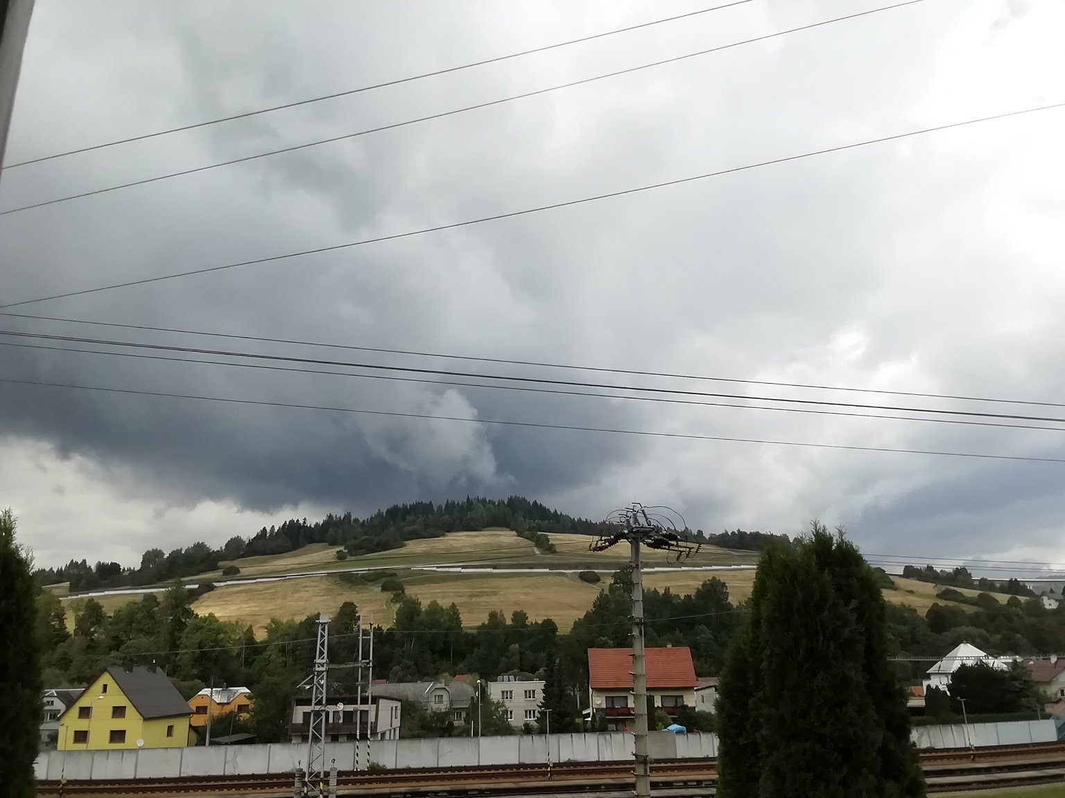 Proměnlivá oblačnost, nyní zataženo se slabou bouřkou a deštěm. Klidno, tlak 1014 hPa.