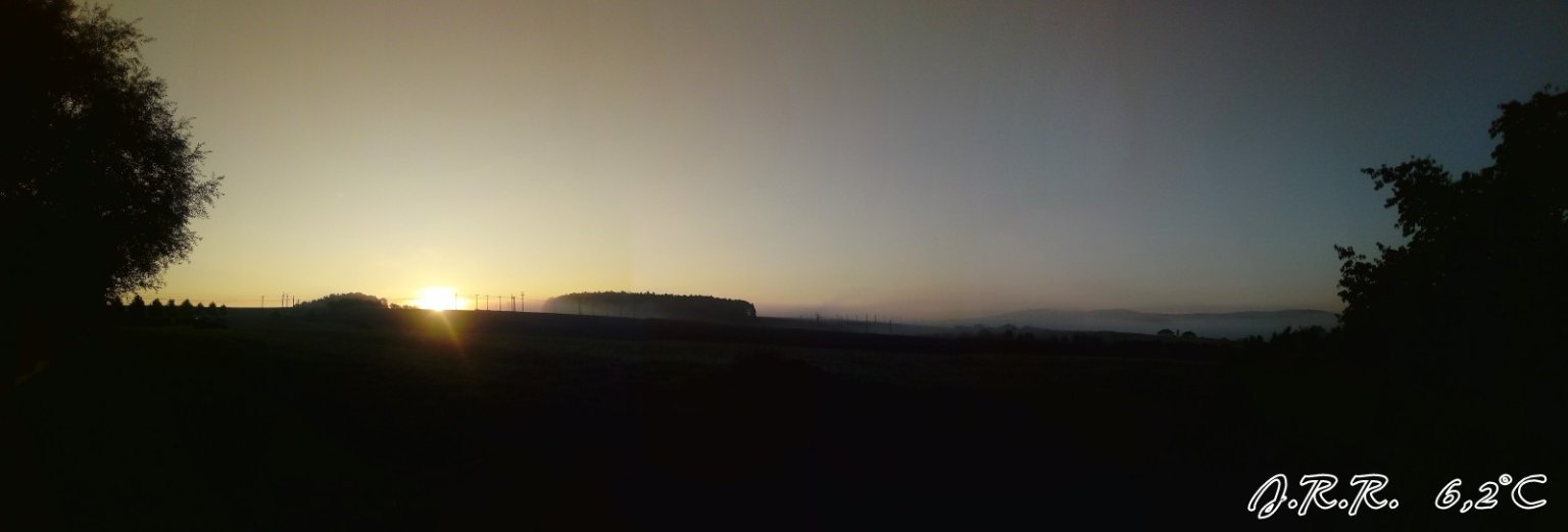 Studené ráno, ranní min. teplota 8,1 °C. Vánek, tlak 1022,3 hPa, vlhkost 96 %.