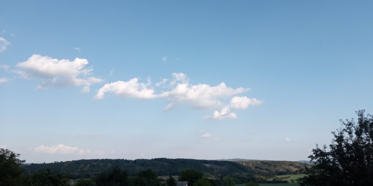 Skoro jasno, směrem na jih až polojasno, bezvětří, vlhkost 44%, pocit dusna minimální. Tvoří se protáhlé nízké kupy.