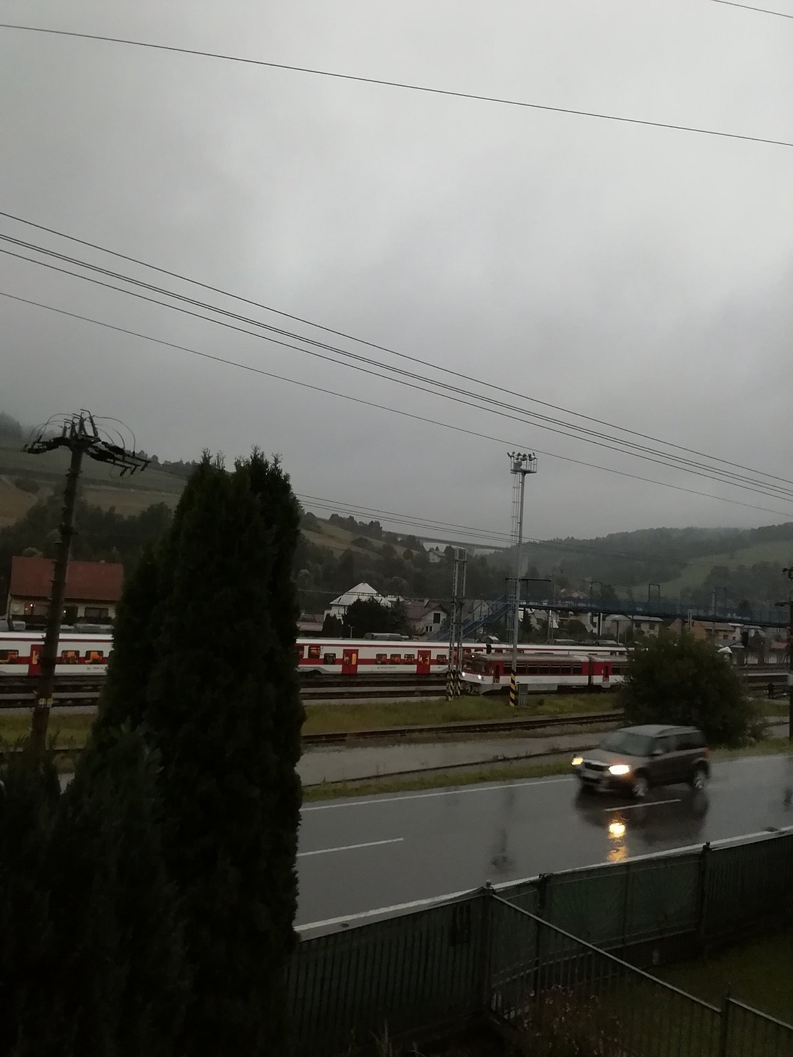 Pravděpodobně 13°C, Slaby dešť. Na Autobusovem stanovišti byla všude voda, řeka Olše měla včera pouhych 92.cm a teď ma 120.cm!