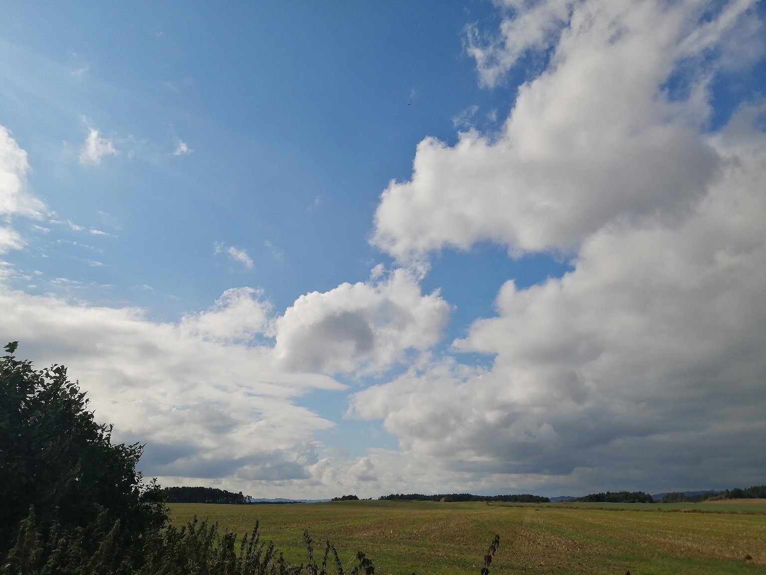 14,7°C, Polojasno. Ze Zapadu až Severozapadu se bliži dalši Oblačnost, ale zatim nepršelo. Tvoři se Kupovite Oblaky.