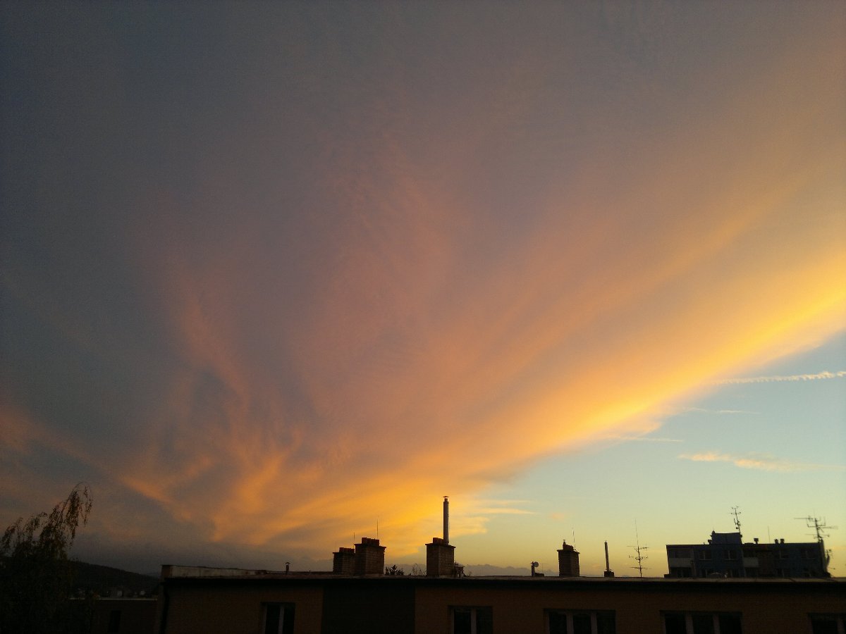 tlak 1020.1 hPa, vlhkost 67.2%...(foto: dnešní západ slunce, opět mezi mraky)