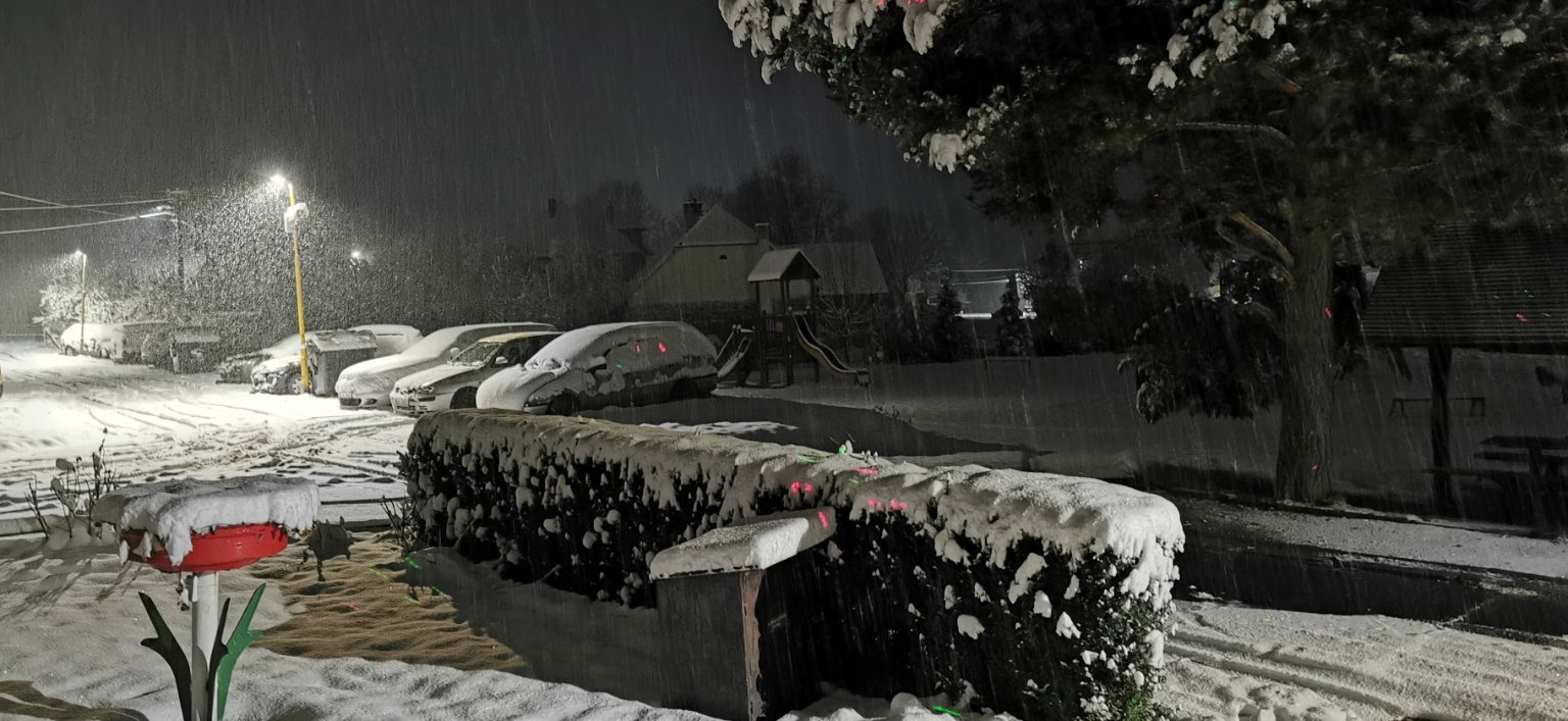 Sněžení už zvolna slábne. Napadlo od 7 do 11cm podle typu povrchu. Nejvíce sněhu je na trávě. Při zemi už je teplota pod nulou, tak to začíná dost klouzat. Je bezvětří, tlak: 994hPa.