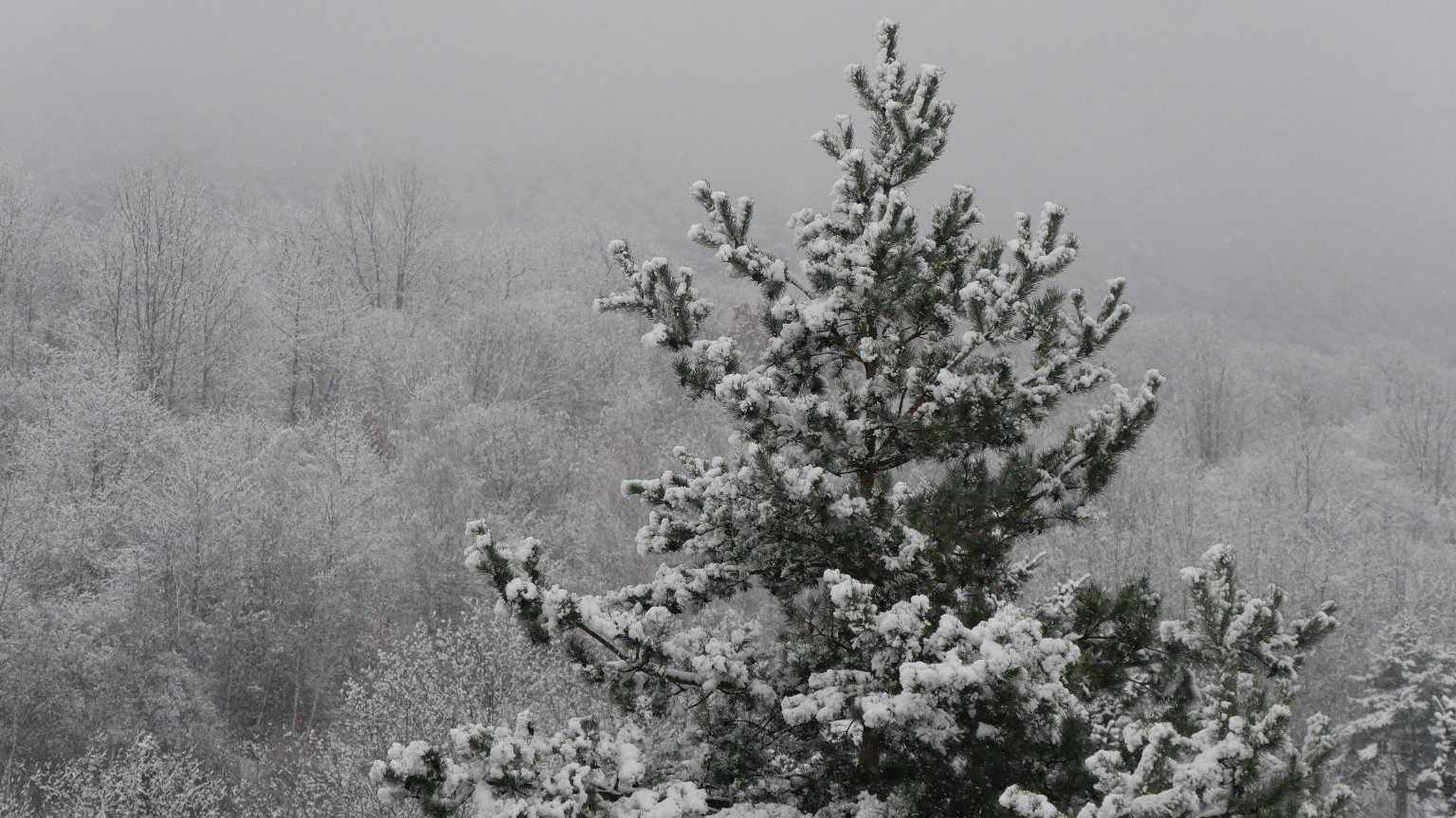 Klidno, mlha, trvalé mírné sněžení, tlak 989 hPa, vlhkost 97%