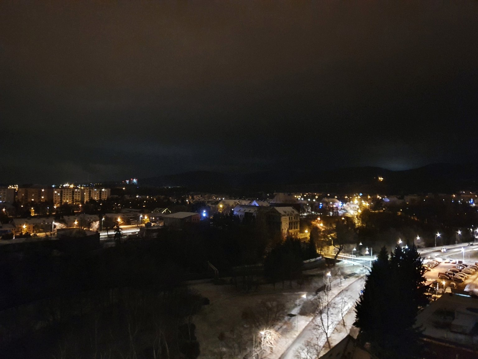 skoro zataženo, sněhové přeháňky, začíná trochu zesilovat vítr, -0.5°C