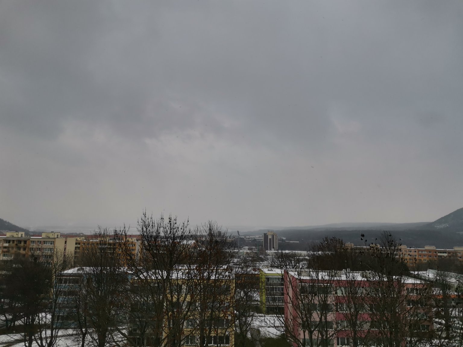 Je zataženo a vane mírný vítr. Sem tam spadne vločka.