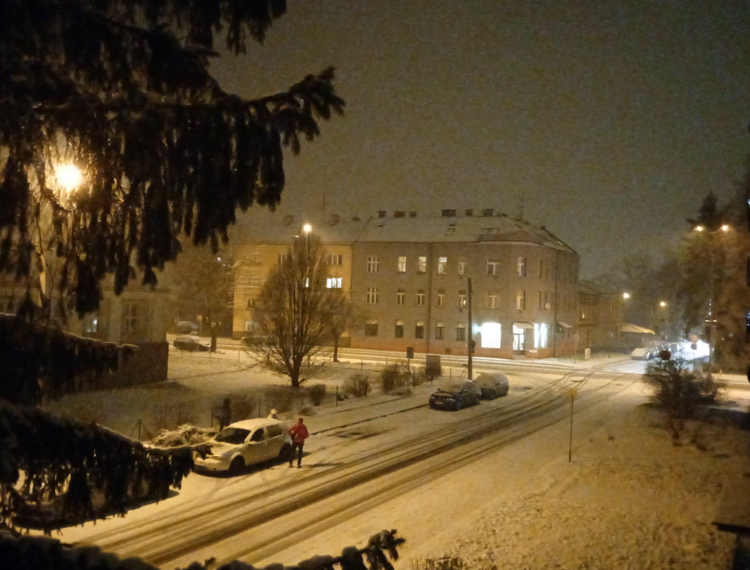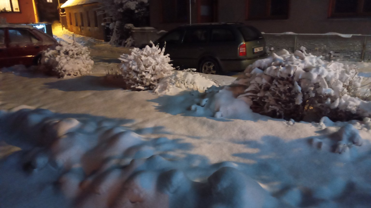 -1,9°C, Mírne sněžení, Sníh: 6,4.cm. Na cestě už budou tak 3.cm sněhu a pod sněhem je led ze staré sněhové pokryvky, dá se na ni už i bobovat! A za 100.m je klesání možná i více než 18% tak zde budou mít auta velký problém vyjet, leda tak s řetězy! (Jedno auto jsem vzadu viděl, ale nevím jestli mělo řetězy).
