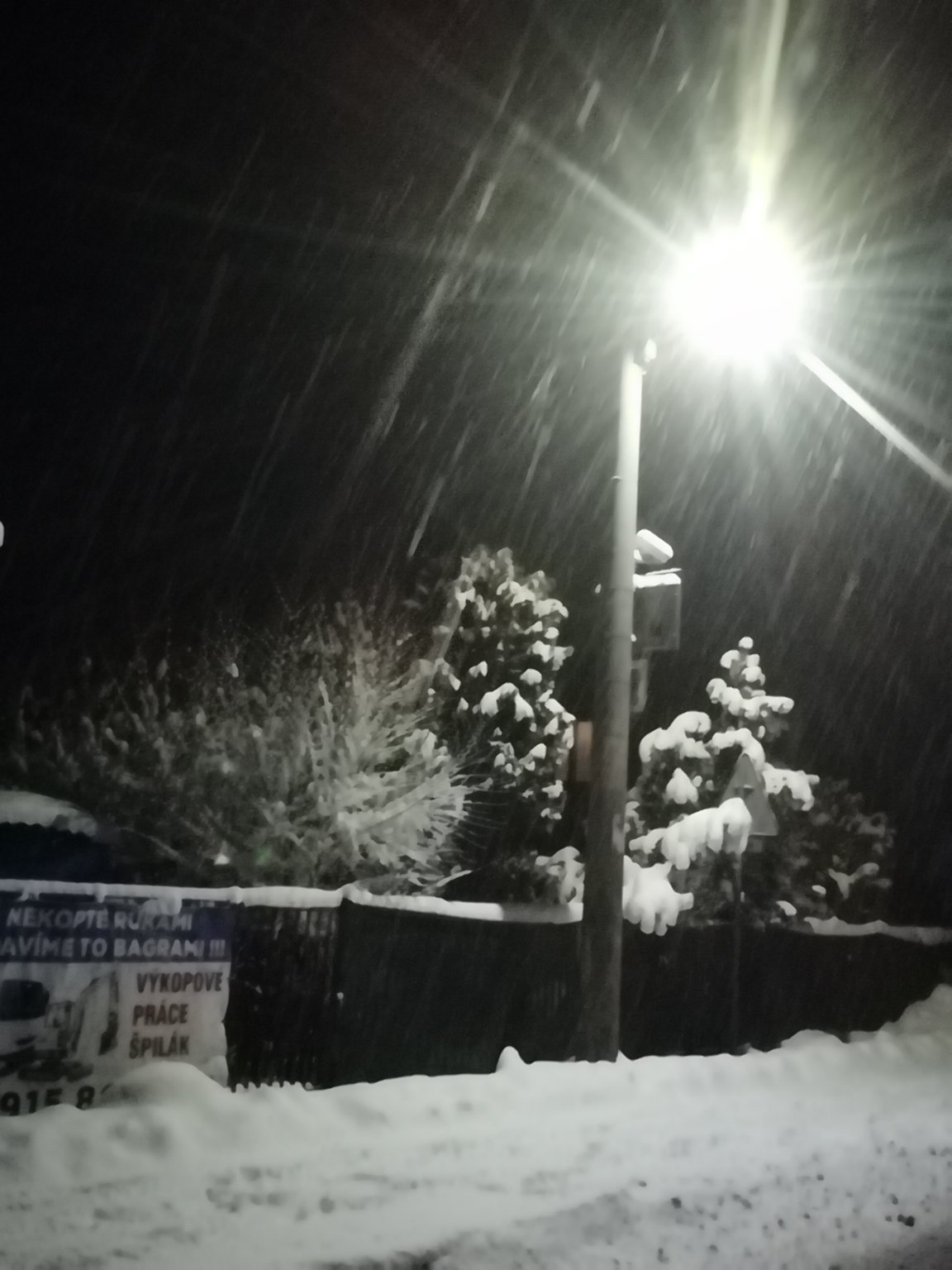 Sníh cca 18 cm. Stále padá. Už slušná peřina.