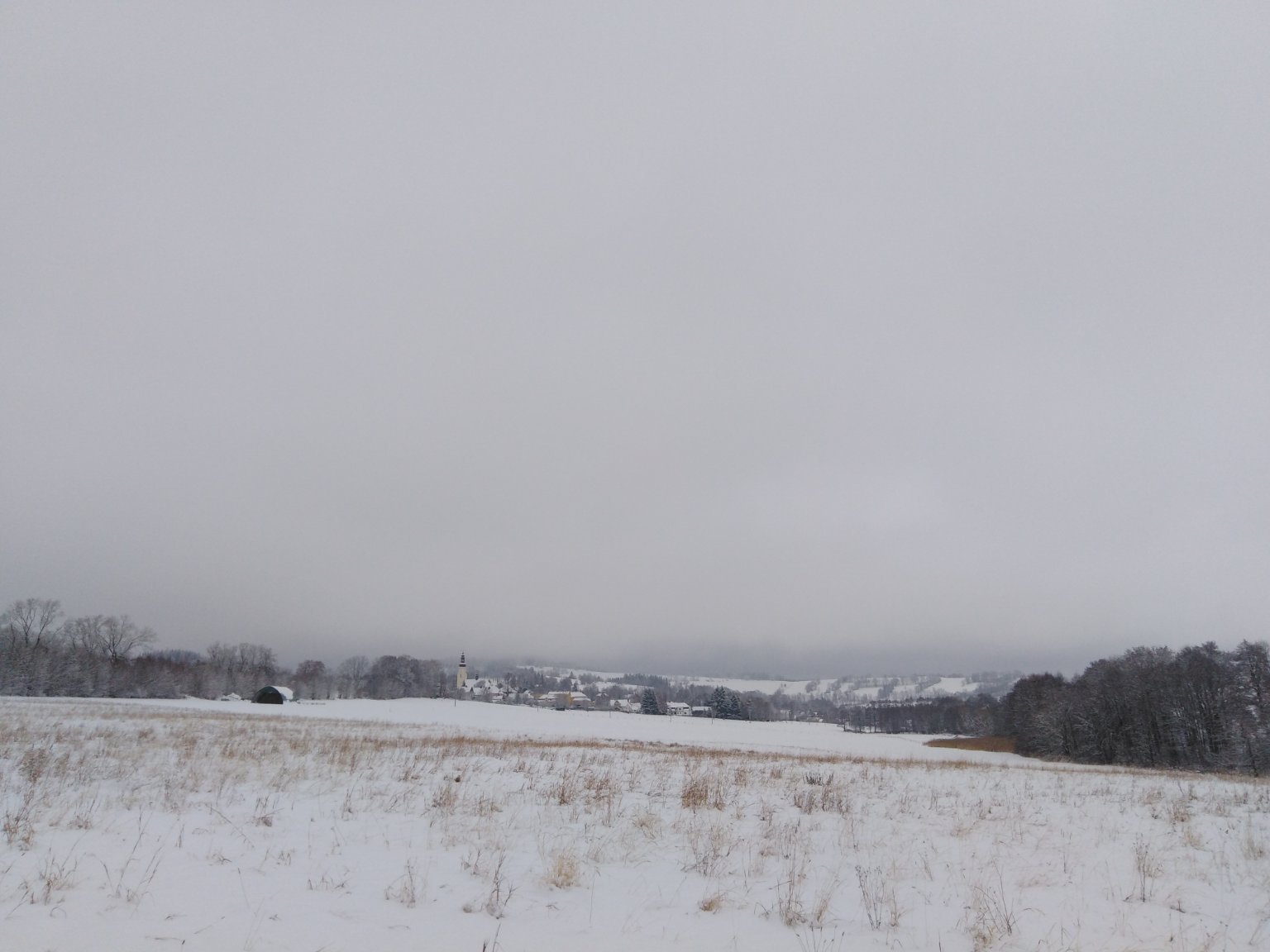 Středně vysoká oblačnost, mokré komunikace, Doupovské hory zasněžené