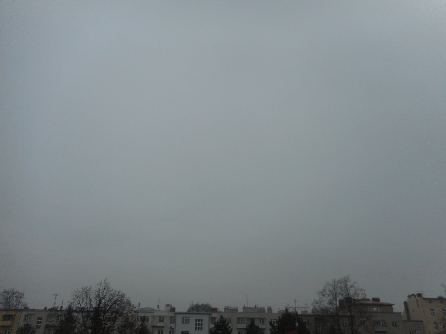 Přízemní mlha, po vydatném dešti pomalu zesiluje. Slabě se oteplilo, mrholí.