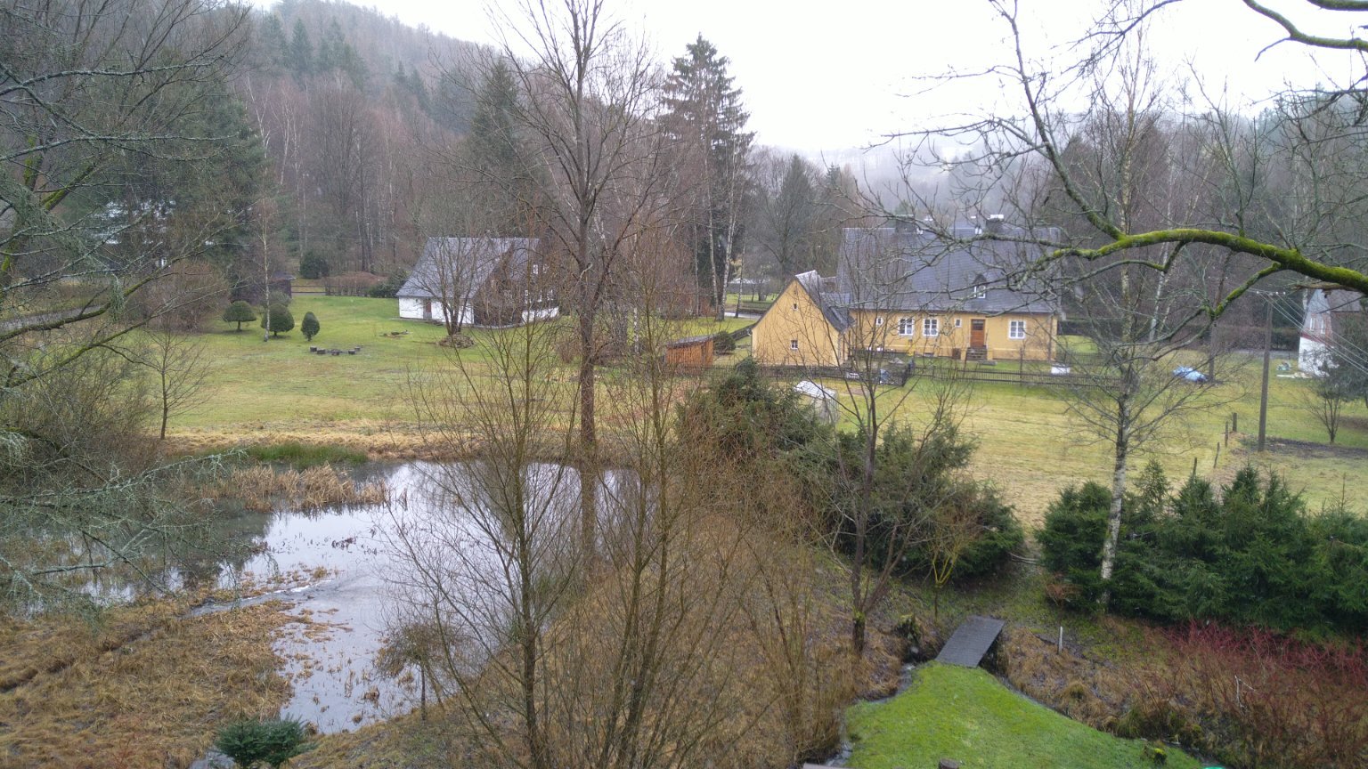 Zataženo, vysoká oblačnost, střeně silný vítr, vrcholky Doupovských hor slabý poprašek sněhu