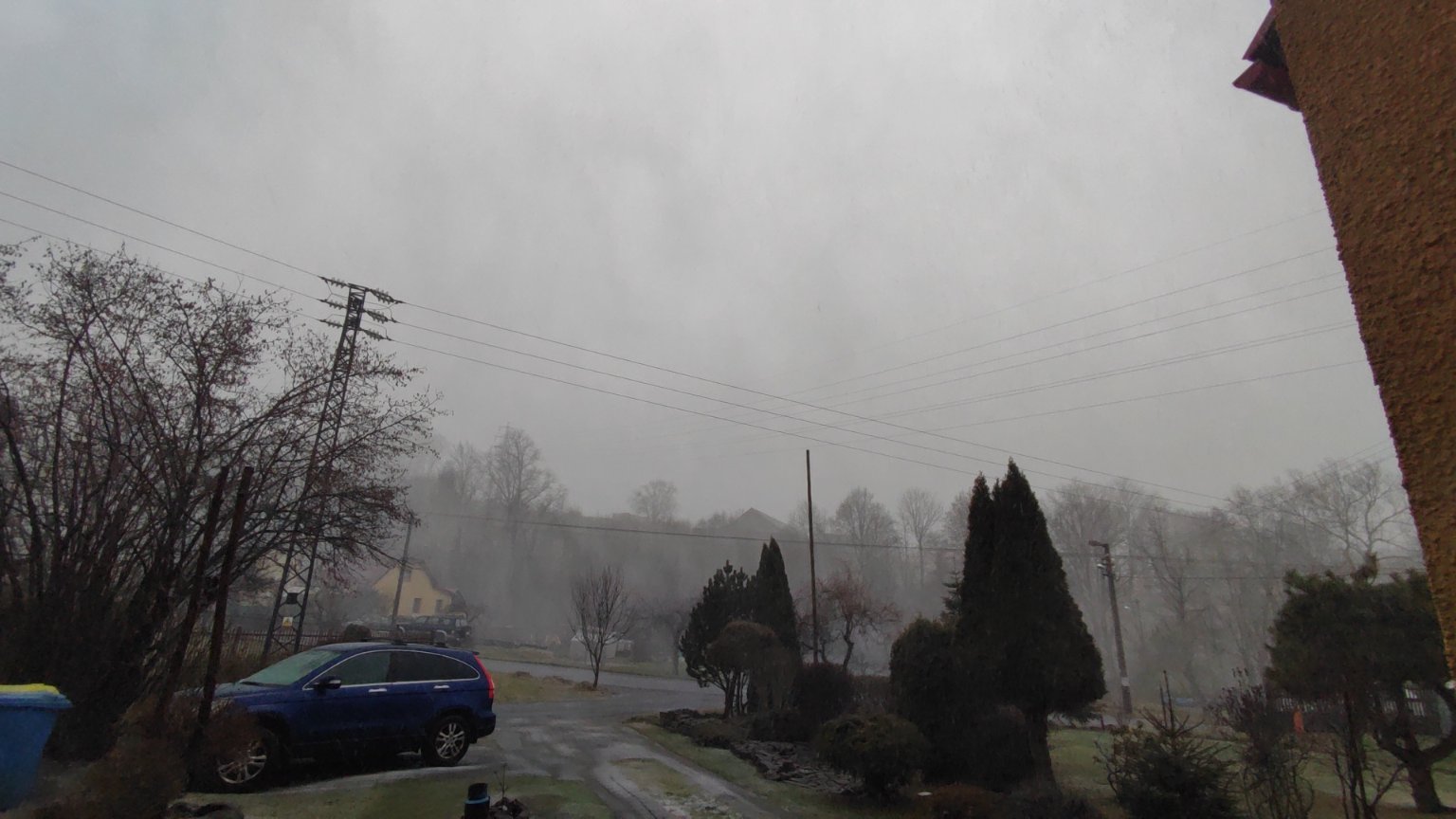 Zamračené, slabé až mierne sneženie, silno veterno!!, vzdialená búrka