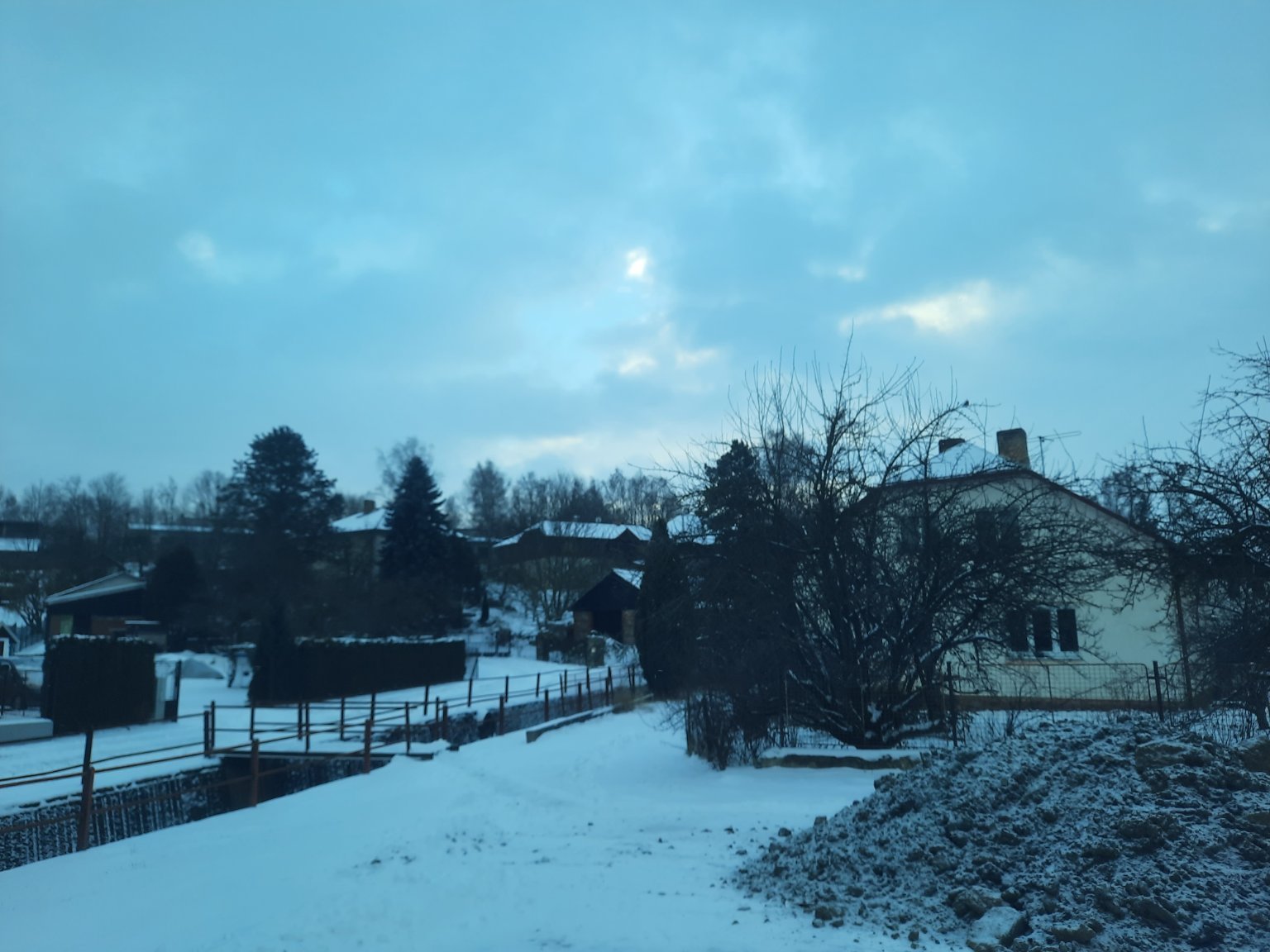 Slabě sněží, S vítr 7,5 km/h, tlak 1022 hPa, vlhkost 93%