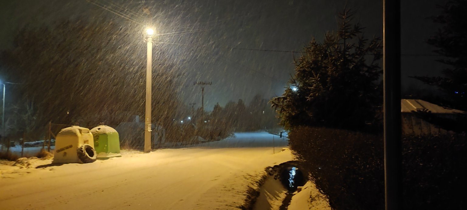 -4,1°C, Mírně až silné sněžení, Sníh: -. Přišla další vlna, ale z Polska se žene tak 2-3× silnější než tato!!!!! Zde je silnice zasněžená ale za mnou za cca 50.m je úplně holá, díky větru!