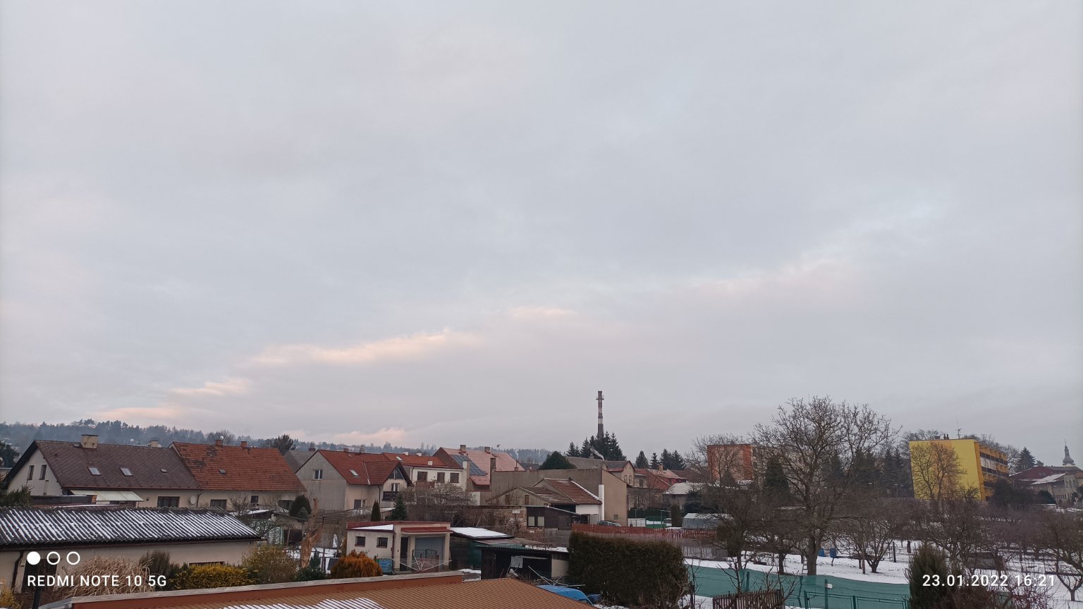 Oblačno, západní větřík, tlak 1032 hPa.
