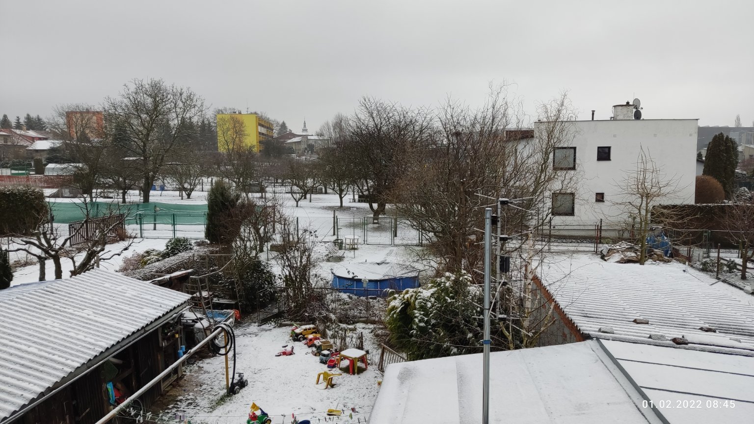 Sněží, ale nefouká. Tlak 1011 hPa, vlhkost 87%, vítr Z.