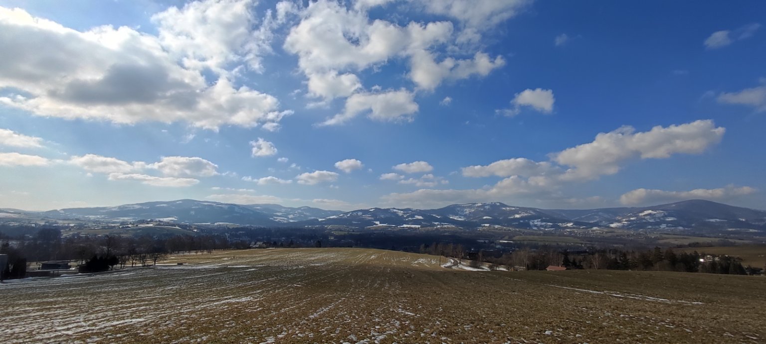 1,7°C, Polojasno, Sníh: nesouvislý. Krásně zasněžený Stožek (979 m.n.m).