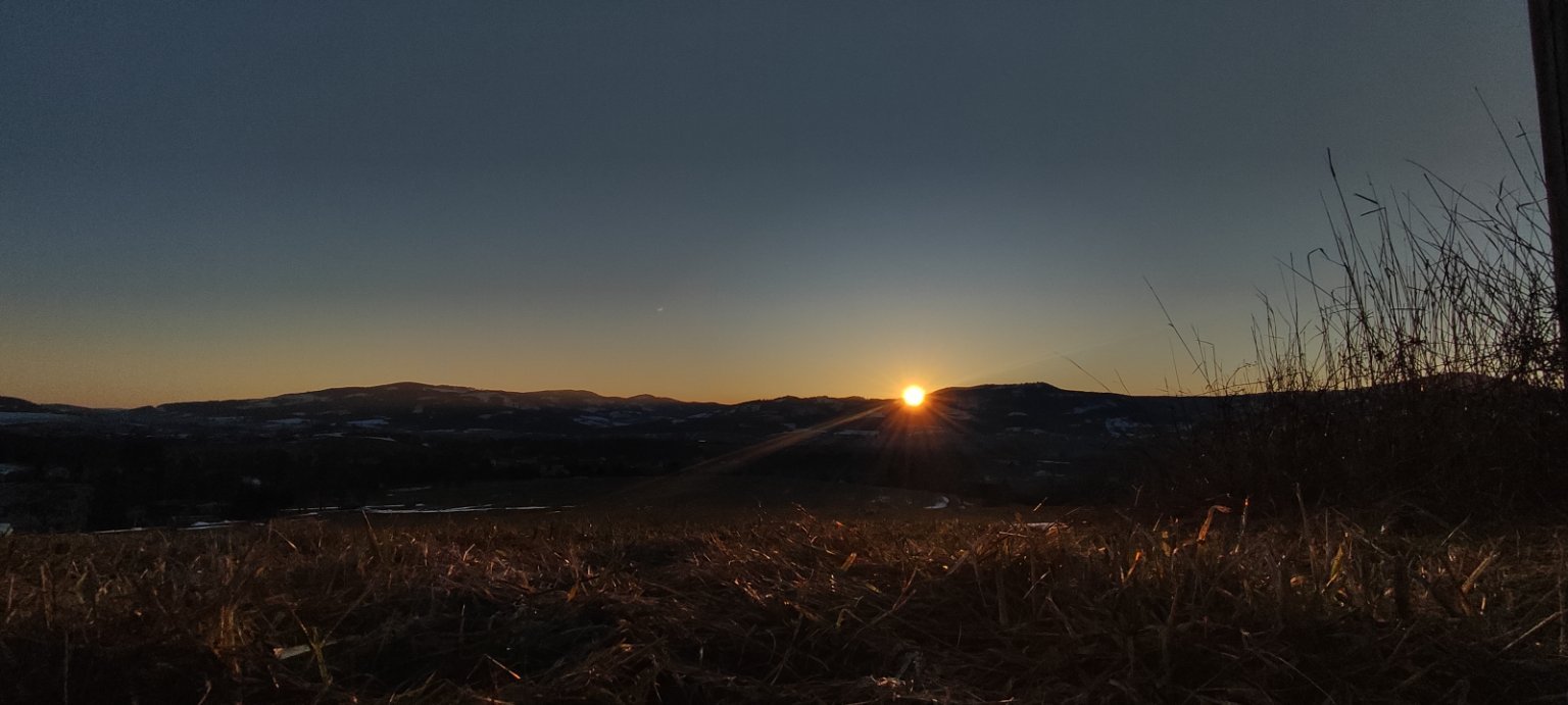 0,8°C, Jasno, Sníh: nesouvislý. Slunce zapadá.