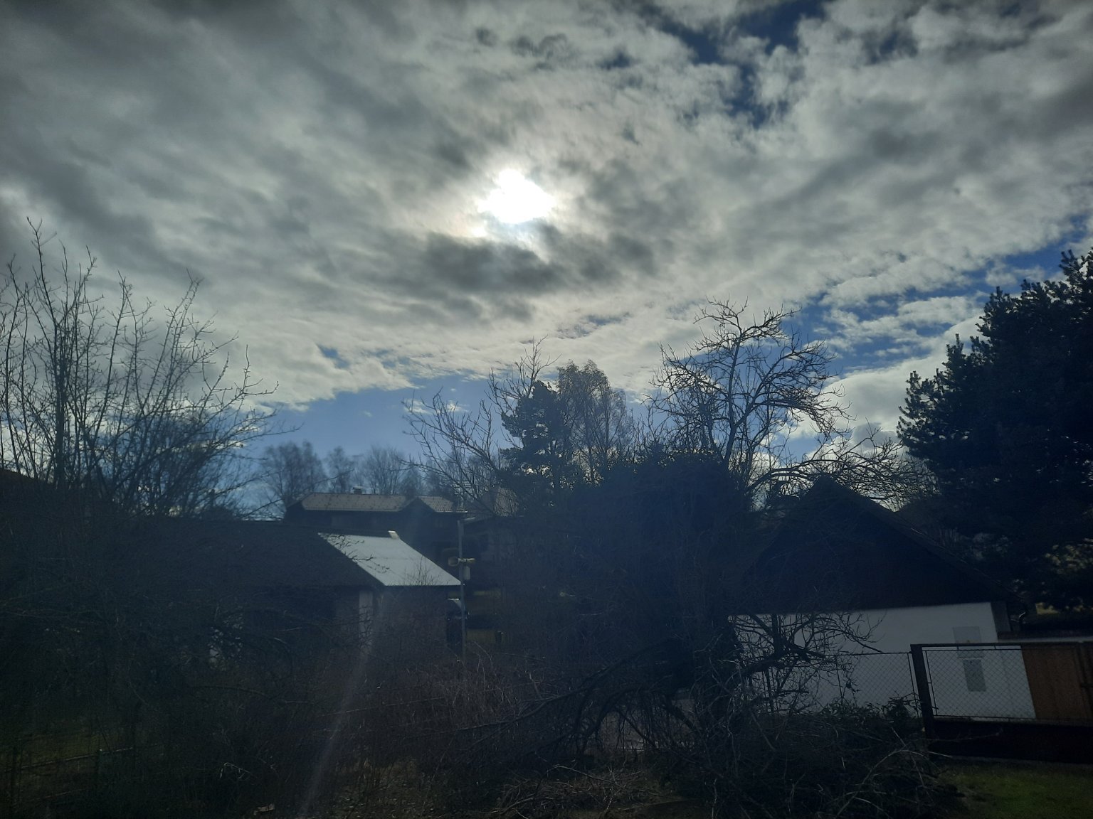 Četné dešťové přeháňky. Už asi 10x dnes byla duha. Po zatím nejsilnějším nárazu větru, který byl přesně 25m/s vítr přechodně zeslábl, nyní už se ale opět vyskytují nárazy okolo 20m/s a vítr působí i škody. Tlak: 997hPa.
