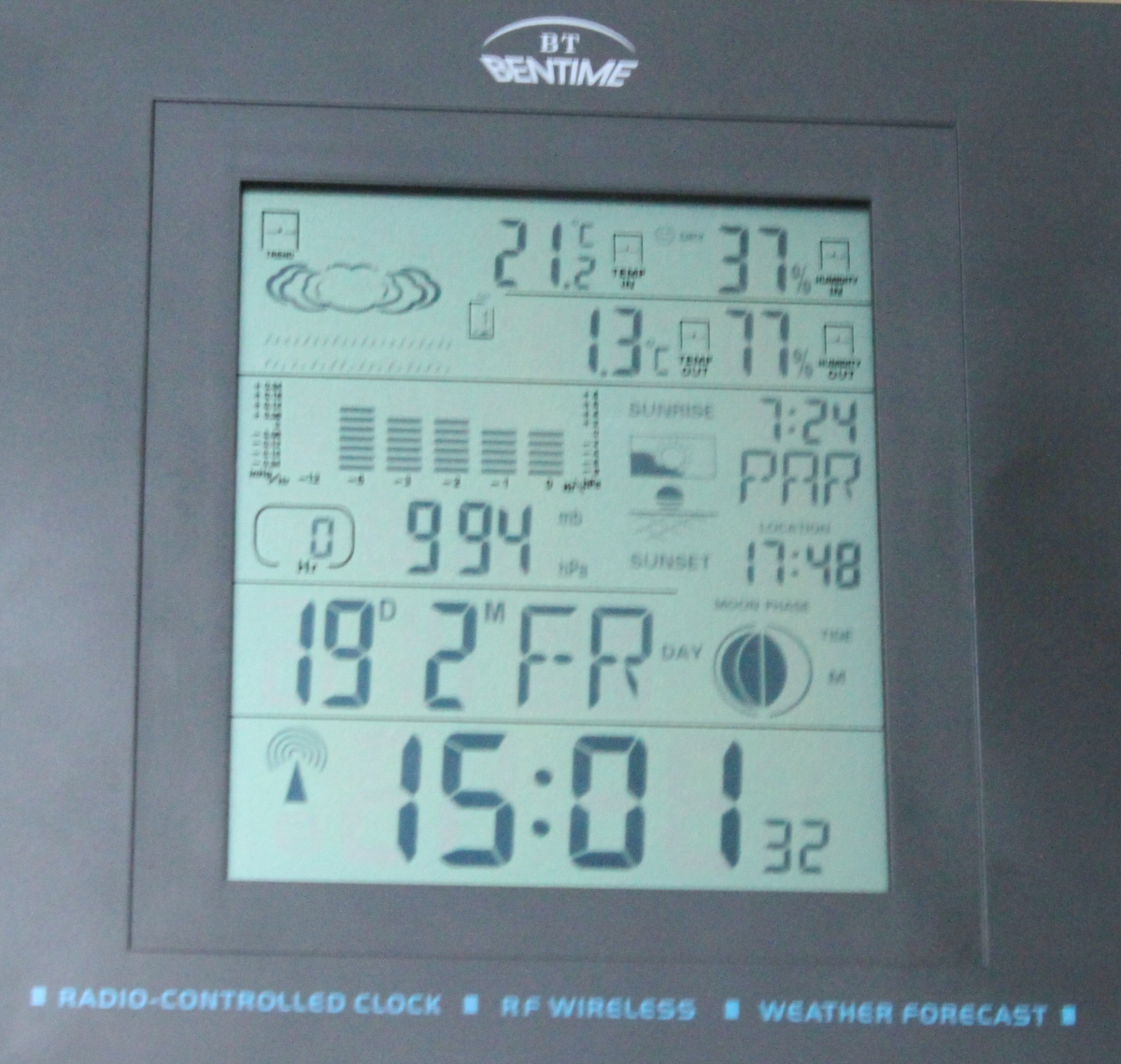 tlak 994hPa, srážky 1mm, vítr 30km/h, max. náraz 52,2km/h.