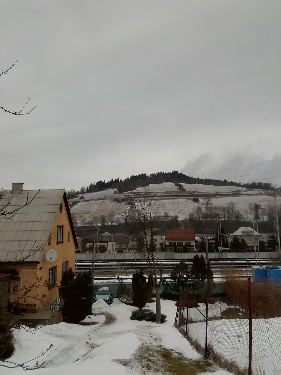 1,6°C, Velmi slabé až zanedbatelne sněženi, Sníh: nesouvislý. V Jablunkově už skoro vše roztálo a tady je bílo! Ale i tak už je nesouvislý...