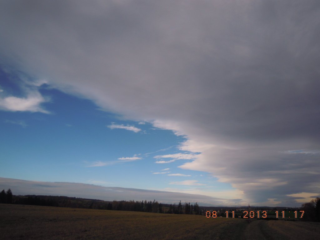 neuvěřitelné teplo, fouká dokonce silný ale teplý vítr - foto z 2013 11 08 v 11:45 zachycuje na obzoru modrou oblohu a snahu sluníčka dostat se z mraků, zatím tu nemá šanci - nad hlavou černé cáry mraků