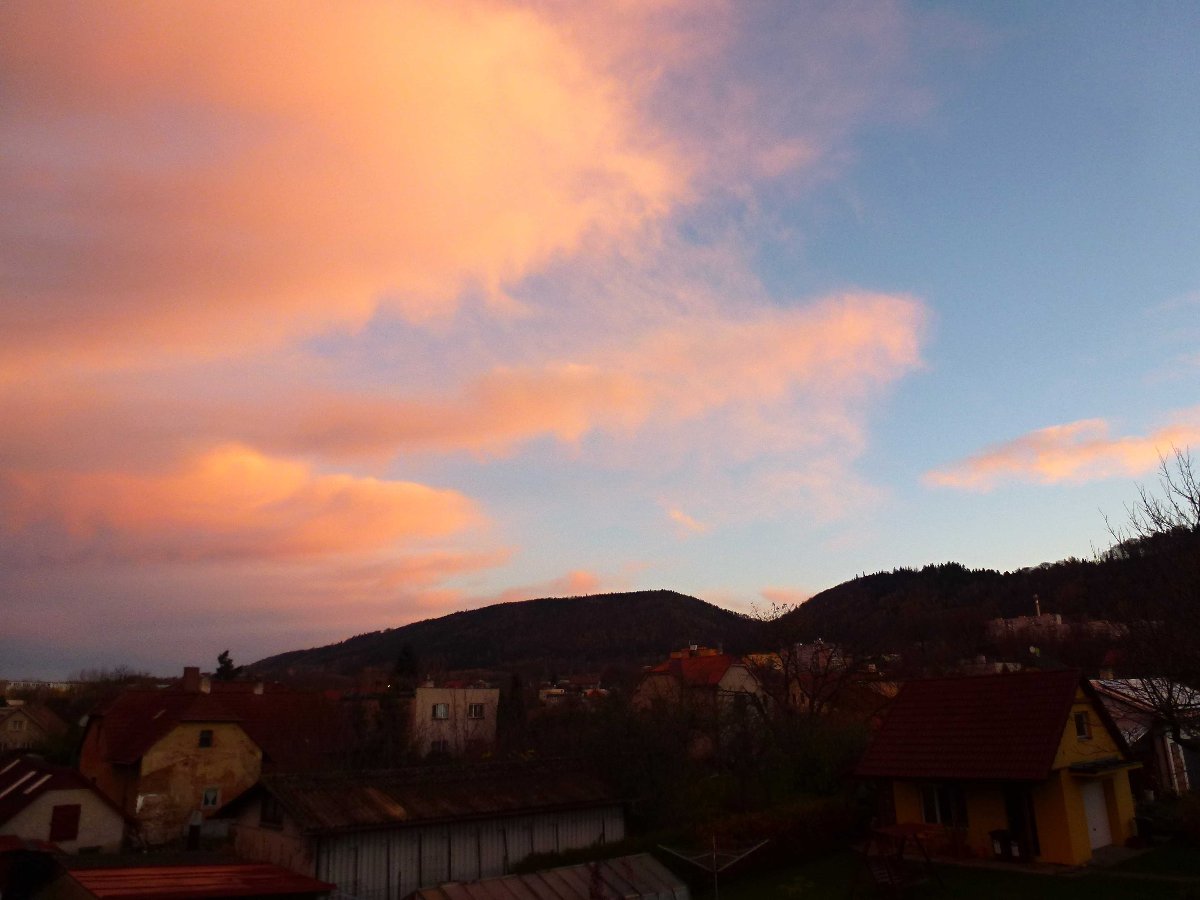 Slunce zapadlo a rychle se ochlazuje, vysokou oblačnost západ slunce hezky obarvil